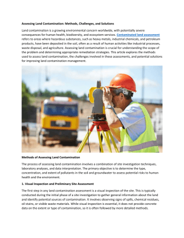 Assessing Land Contamination: Methods, Challenges, and Solutions Land contamination is a growing environmental concern worldwide, with potentially severe consequences for human health, biodiversity, and ecosystem services. Contaminated land assessment refers to areas where hazardous substances, such as heavy metals, industrial chemicals, and petroleum products, have been deposited in the soil, often as a result of human activities like industrial processes, waste disposal, and agriculture. Assessing land contamination is crucial for understanding the scope of the problem and determining appropriate remediation strategies. This article explores the methods used to assess land contamination, the challenges involved in these assessments, and potential solutions for improving land contamination management. Methods of Assessing Land Contamination The process of assessing land contamination involves a combination of site investigation techniques, laboratory analyses, and data interpretation. The primary objective is to determine the type, concentration, and extent of pollutants in the soil and groundwater to assess potential risks to human health and the environment. 1. Visual Inspection and Preliminary Site Assessment The first step in any land contamination assessment is a visual inspection of the site. This is typically conducted during the initial phase of a site investigation to gather general information about the land and identify potential sources of contamination. It involves observing signs of spills, chemical residues, oil stains, or visible waste materials. While visual inspection is essential, it does not provide concrete data on the extent or type of contamination, so it is often followed by more detailed methods. A Preliminary Site Assessment (PSA) or Phase I Environmental Site Assessment (ESA) is another essential technique. During this phase, a thorough review of historical land use, aerial photographs, and previous environmental reports is carried out. Interviews with local residents and employees may also be conducted to gain insights into past activities that could have contributed to contamination. 2. Soil Sampling and Analysis Soil sampling is one of the most reliable methods for detecting and quantifying contaminants in the land. A series of soil samples are collected at various depths and locations across the site to obtain a representative understanding of contamination levels. The samples are then sent to a laboratory where they are analyzed for various chemicals and pollutants, including metals (e.g., lead, mercury, arsenic), volatile organic compounds (VOCs), pesticides, and hydrocarbons. Soil analysis techniques can include: Gas Chromatography-Mass Spectrometry (GC-MS): Used to detect volatile and semi-volatile organic compounds. Atomic Absorption Spectroscopy (AAS): Commonly used for heavy metal analysis. Inductively Coupled Plasma Mass Spectrometry (ICP-MS): For trace element analysis and detecting low concentrations of metals. This method provides quantitative data on the types and concentrations of contaminants, which is critical for evaluating the risk to human health and the environment. 3. Groundwater Monitoring In many cases, contaminants in the soil migrate to groundwater, where they pose a risk to drinking water supplies. Groundwater monitoring involves installing wells at strategic locations to collect water samples over time. These samples are analyzed for the presence of contaminants that have leached from the soil. Groundwater analysis can help determine the extent of contamination in both vertical and horizontal directions, providing an essential perspective on the potential migration of pollutants. 4. Geophysical Methods Geophysical techniques are increasingly used to assess land contamination, especially in complex or large sites. These methods, which include electrical resistivity, electromagnetic surveys, and groundpenetrating radar (GPR), provide information about the physical properties of the subsurface. Geophysical methods can help identify areas of contamination without the need for intrusive soil sampling, making them useful in preliminary assessments or in areas where access to the land is restricted. 5. Risk Assessment Models Risk assessment models play an essential role in determining the potential health risks associated with land contamination. These models use data from soil and groundwater analyses to estimate the likelihood of exposure to hazardous substances and the potential effects on human health or ecosystems. They consider factors such as the concentration of contaminants, their mobility, and the potential pathways of exposure (e.g., ingestion, inhalation, or skin contact). Challenges in Land Contamination Assessment While assessing land contamination is vital, it presents several challenges. Some of the key difficulties include: 1. Inconsistent Data and Historical Information Land contamination often results from decades of industrial activities, and historical records may be incomplete or unreliable. This makes it challenging to identify the exact source, nature, and extent of contamination. Additionally, some pollutants, such as heavy metals, may have been introduced to the site over an extended period, making it difficult to assess the full scope of the contamination at once. 2. Complexity of Contaminant Behavior Some contaminants, like petroleum hydrocarbons or volatile organic compounds, can migrate through the soil or groundwater in unpredictable ways. They may break down or transform into other toxic compounds, complicating the assessment process. Furthermore, some pollutants may be present at low concentrations or in forms that are difficult to detect, requiring advanced analytical techniques. 3. Cost and Resource Constraints Comprehensive land contamination assessments are often resource-intensive, requiring sophisticated laboratory analyses, fieldwork, and expert interpretation of results. For many communities and o