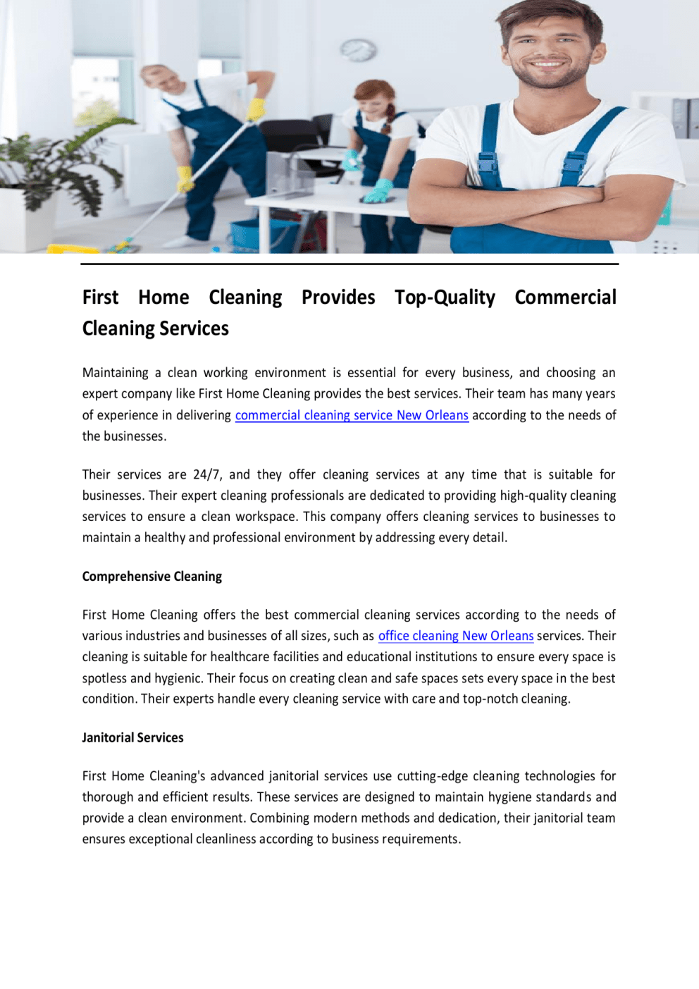 First Home Cleaning Provides Top-Quality Commercial Cleaning Services Maintaining a clean working environment is essential for every business, and choosing an expert company like First Home Cleaning provides the best services. Their team has many years of experience in delivering commercial cleaning service New Orleans according to the needs of the businesses. Their services are 24/7, and they offer cleaning services at any time that is suitable for businesses. Their expert cleaning professionals are dedicated to providing high-quality cleaning services to ensure a clean workspace. This company offers cleaning services to businesses to maintain a healthy and professional environment by addressing every detail. Comprehensive Cleaning First Home Cleaning offers the best commercial cleaning services according to the needs of various industries and businesses of all sizes, such as office cleaning New Orleans services. Their cleaning is suitable for healthcare facilities and educational institutions to ensure every space is spotless and hygienic. Their focus on creating clean and safe spaces sets every space in the best condition. Their experts handle every cleaning service with care and top-notch cleaning. Janitorial Services First Home Cleaning's advanced janitorial services use cutting-edge cleaning technologies for thorough and efficient results. These services are designed to maintain hygiene standards and provide a clean environment. Combining modern methods and dedication, their janitorial team ensures exceptional cleanliness according to business requirements. This attention to detail makes their janitorial services provide the best clean and ultimate quality control available at your fingertips. Their cleaning professionals use the latest technologies and follow procedures to maintain a clean and healthy environment. Specialty Cleaning Services First Home Cleaning also offers specialty cleaning services with high-standard cleaning practices. Every commercial space may not have the same cleaning requirements, but these services are designed to address unique challenges for improving the workplace's overall appearance and functionality. This helps maintain the spaces in their best and original condition. Choosing this cleaning company New Orleans ensures that every workspace not only looks better but also feels more welcoming to everyone. Flexible Project-Based First Home Cleaning provides project-based cleaning services for businesses according to their specific requirements. Businesses can choose suitable services based on their needs, such as handling periodic or one-time cleaning tasks or seasonal deep cleaning. This customized approach ensures their services can fit the schedule and preferences of the businesses. This company provides cleaning services without disrupting daily operations. This company's ability to deliver high-quality results makes cleaning services essential for every project to maintain a spotless environment. To get more details, visit https://www.firsthomecleaning.com/ Original Source: https://bit.ly/3PM9TRj