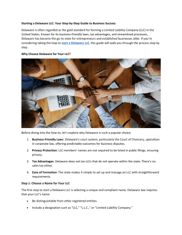 Starting a Delaware LLC: Your Step-by-Step Guide to Business Success Delaware is often regarded as the gold standard for forming a Limited Liability Company (LLC) in the United States. Known for its business-friendly laws, tax advantages, and streamlined processes, Delaware has become the go-to state for entrepreneurs and established businesses alike. If you’re considering taking the leap to start a Delaware LLC, this guide will walk you through the process step by step. Why Choose Delaware for Your LLC? Before diving into the how-to, let’s explore why Delaware is such a popular choice: 1. Business-Friendly Laws: Delaware's court system, particularly the Court of Chancery, specializes in corporate law, offering predictable outcomes for business disputes. 2. Privacy Protection: LLC members’ names are not required to be listed in public filings, ensuring privacy. 3. Tax Advantages: Delaware does not tax LLCs that do not operate within the state. There’s no sales tax either. 4. Ease of Formation: The state makes it simple to set up and manage an LLC with straightforward requirements. Step 1: Choose a Name for Your LLC The first step to start a Delaware LLC is selecting a unique and compliant name. Delaware law requires that your LLC’s name: Be distinguishable from other registered entities. Include a designation such as "LLC," "L.L.C.," or "Limited Liability Company." To check name availability, use the Delaware Division of Corporations’ online search tool. Once you’ve found an available name, you may reserve it for 120 days by filing a Name Reservation Application and paying a small fee. Step 2: Appoint a Registered Agent Every Delaware LLC must have a registered agent—an individual or company responsible for receiving legal and official documents on behalf of your business. The registered agent must have a physical address in Delaware and be available during normal business hours. You can act as your own registered agent if you meet the residency requirement, but many business owners prefer hiring professional registered agent services to ensure reliability and compliance. Step 3: File a Certificate of Formation The Certificate of Formation is the official document that establishes your LLC in Delaware. Here’s what it includes: LLC name. Registered agent’s name and address. Optional details, such as the LLC’s duration or specific purposes. Submit this document to the Delaware Division of Corporations either online, by mail, or in person. The filing fee is typically $90, though expedited services are available for an additional cost if you’re in a rush. Step 4: Create an Operating Agreement Although not required by Delaware law, an Operating Agreement is an essential internal document. It outlines the ownership structure, management roles, voting rights, and financial arrangements of your LLC. This agreement helps: Prevent disputes among members. Define the rules governing your business. Demonstrate the legitimacy of your LLC to banks and investors. Step 5: Obtain an EIN from the IRS An Employer Identification Number (EIN) is like a Social Security number for your business. It’s required for: Opening a business bank account. Hiring employees. Filing federal taxes. You can apply for an EIN for free through the IRS website, by mail, or by fax. Step 6: Fulfill Tax and Compliance Requirements Delaware LLCs are subject to certain ongoing tax and compliance obligations: 1. Annual Franchise Tax: All Delaware LLCs must pay an annual franchise tax of $300, due by June 1 each year. 2. Federal Taxes: Depending on your business’s activities and classification, you may need to file federal income tax returns. 3. State Taxes: If your LLC operates outside of Delaware, ensure compliance with local tax regulations in the states where you do business. Step 7: Open a Business Bank Account A dedicated business bank account is crucial for maintaining a clear separation between personal and business finances. When opening the account, you’ll typically need: A copy of your Certificate of Formation. Your LLC Operating Agreement. Your EIN. Step 8: Obtain Necessary Licenses and Permits Depending on your industry and location, your LLC may require specific licenses or permits. Research local, state, and federal requirements to ensure compliance. Step 9: Maintain Good Standing To keep your Delaware LLC in good standing, it’s important to: Pay your annual franchise tax on time. Keep your registered agent information up to date. File any required reports or updates with the state. Advantages of Starting a Delaware LLC Starting a Delaware LLC offers several key benefits, including: Limited Liability Protection: Safeguard your personal assets from business liabilities. Operational Flexibility: Manage your LLC in any state while benefiting from Delaware’s legal framework. Scalability: Ideal for small startups and growing enterprises alike. Conclusion Starting a Delaware LLC is a strategic move for entrepreneurs seeking a robust legal structure and favorable business environment. By following these steps, you can establish a strong foundation for your business and set the stage for long-term success. Whether you’re forming a single-member LLC or a multi-member entity, Delaware offers unparalleled advantages that make it the premier choice for business formation. Web:- https://delaware.houseofcompanies.in/start-a-delaware-llc/ #BusinessregistrationDelaware, #StartaDelawareLLC, #ApplyforDelawareSalesTaxID, #DelawareVirtualoffice