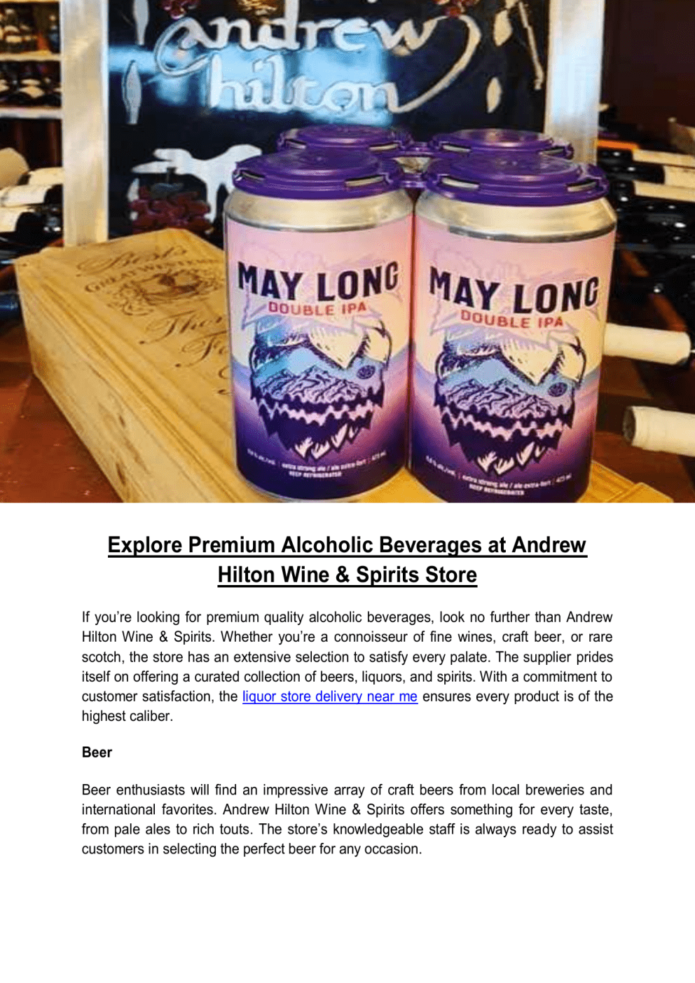 Explore Premium Alcoholic Beverages at Andrew Hilton Wine & Spirits Store If you’re looking for premium quality alcoholic beverages, look no further than Andrew Hilton Wine & Spirits. Whether you’re a connoisseur of fine wines, craft beer, or rare scotch, the store has an extensive selection to satisfy every palate. The supplier prides itself on offering a curated collection of beers, liquors, and spirits. With a commitment to customer satisfaction, the liquor store delivery near me ensures every product is of the highest caliber. Beer Beer enthusiasts will find an impressive array of craft beers from local breweries and international favorites. Andrew Hilton Wine & Spirits offers something for every taste, from pale ales to rich touts. The store’s knowledgeable staff is always ready to assist customers in selecting the perfect beer for any occasion. Single Malt Scotch For scotch lovers, Andrew Hilton Wine & Spirits is a must-visit store. The supplier has a fantastic range of single malt scotches, including rare and limited-edition bottles. Whether you’re a seasoned scotch enthusiast or a new one, this collection has something to satisfy every preference. Growler Fills Andrew Hilton Wine & Spirits’s alcohol delivery Lethbridge store provides home draft beer, which is erfect for sharing with friends or enjoying at home. The supplier takes pride in its unique growler fill station, where customers can fill their growlers with fresh beer. Its store offers a rotating selection of beer for growler fills, ensuring there’s always something new to try. Why Choose Andrew Hilton Wine & Spirits? Andrew Hilton Wine & Spirits stands out for its dedication to providing premium alcoholic products. The supplier’s team ensures a personalized shopping experience, whether you’re buying a specific bottle or exploring new options. With a focus on quality, the supplier ensures every product in its store meets the highest standards. Andrew Hilton Wine & Spirits shop is available for everyone, from seasoned drinkers or newcomers to spirits and beer. The team is passionate about offering the best in beer, whisky, and other fine alcoholic beverages. It provides satisfied services and offerings to a huge community. Andrew Hilton Wine & Spirits is one of the closest liquor stores near me that offers premium products. With a wide selection of alcoholic beverages, the store is the perfect place for anyone looking to enjoy high-quality drinks. From fine wines to rare liqueurs, the store has something to suit every taste. You can get rare scotch, craft beer, or other favorite wines at the store. Order your favorite beverage at https://andrewhiltonwine.ca/ Original Source: https://bit.ly/4avlKfU