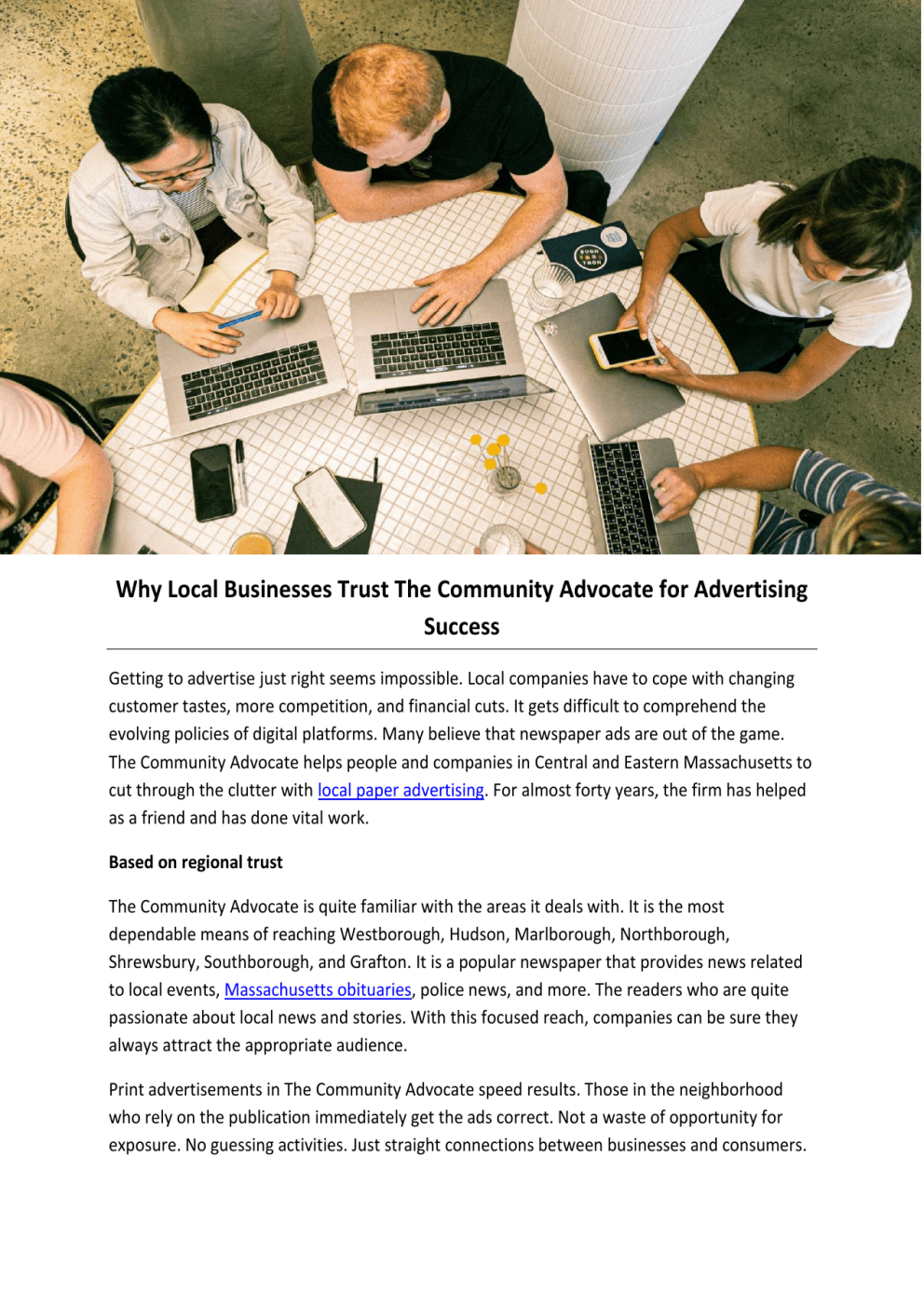 Why Local Businesses Trust The Community Advocate for Advertising Success Getting to advertise just right seems impossible. Local companies have to cope with changing customer tastes, more competition, and financial cuts. It gets difficult to comprehend the evolving policies of digital platforms. Many believe that newspaper ads are out of the game. The Community Advocate helps people and companies in Central and Eastern Massachusetts to cut through the clutter with local paper advertising. For almost forty years, the firm has helped as a friend and has done vital work. Based on regional trust The Community Advocate is quite familiar with the areas it deals with. It is the most dependable means of reaching Westborough, Hudson, Marlborough, Northborough, Shrewsbury, Southborough, and Grafton. It is a popular newspaper that provides news related to local events, Massachusetts obituaries, police news, and more. The readers who are quite passionate about local news and stories. With this focused reach, companies can be sure they always attract the appropriate audience. Print advertisements in The Community Advocate speed results. Those in the neighborhood who rely on the publication immediately get the ads correct. Not a waste of opportunity for exposure. No guessing activities. Just straight connections between businesses and consumers. Accuracy provided by Brightway Digital Brightway Digital oversees its digital marketing offerings. The tools companies use to reach particular groups of consumers are geotargeting, email campaigns, and advanced leadgenerating programs. These techniques draw clients eagerly to conduct business. BrightwayDigital, in association with The Community Advocate also creates fantastic corporate websites. Reputable companies inspire people's trust. Making online reviews—and how others view the community helps you build trust. This approach keeps consumers with you. Affordable and truly effective online ads The site is a treasure for advertisers as it receives over 130,000 local page views every month. Without much expenditure, digital display ads grab people's attention and direct them to your website. Small businesses can have all the advantages of a large digital campaign for far less money. It’s not costly and it performs well. Proven Legacy of Success The Community Advocate has been there to guide companies toward success for decades. Through its mix of print, Shrewsbury MA events ads and digital tools have helped businesses with customized plans to meet the demands of nearby companies rather than applying general solutions. The meaning of the results is quite obvious. Businesses in Central Massachusetts see The Community Advocate as effective. Its approach is simple, clear, and quite helpful. The Community Advocate is the best choice for any company aiming at expansion. For more information, visit https://www.communityadvocate.com/ Original Source: https://bit.ly/40z4xxF