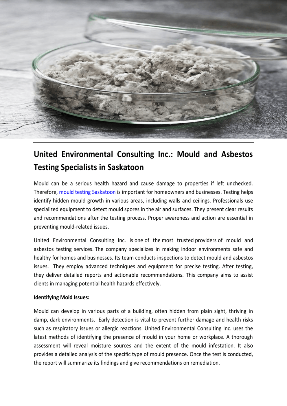 United Environmental Consulting Inc. Mould and Asbestos Testing Specialists in Saskatoon