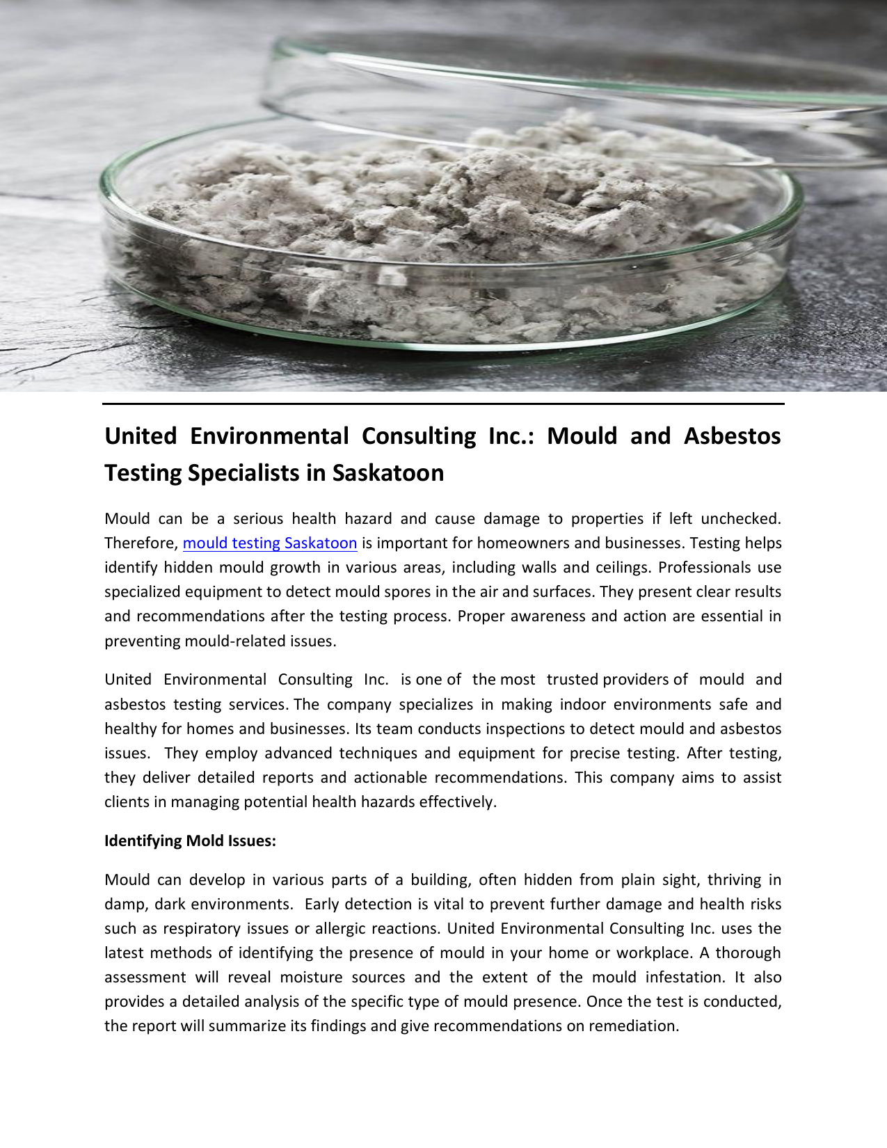 United Environmental Consulting Inc.: Mould and Asbestos Testing Specialists in Saskatoon Mould can be a serious health hazard and cause damage to properties if left unchecked. Therefore, mould testing Saskatoon is important for homeowners and businesses. Testing helps identify hidden mould growth in various areas, including walls and ceilings. Professionals use specialized equipment to detect mould spores in the air and surfaces. They present clear results and recommendations after the testing process. Proper awareness and action are essential in preventing mould-related issues. United Environmental Consulting Inc. is one of the most trusted providers of mould and asbestos testing services. The company specializes in making indoor environments safe and healthy for homes and businesses. Its team conducts inspections to detect mould and asbestos issues. They employ advanced techniques and equipment for precise testing. After testing, they deliver detailed reports and actionable recommendations. This company aims to assist clients in managing potential health hazards effectively. Identifying Mold Issues: Mould can develop in various parts of a building, often hidden from plain sight, thriving in damp, dark environments. Early detection is vital to prevent further damage and health risks such as respiratory issues or allergic reactions. United Environmental Consulting Inc. uses the latest methods of identifying the presence of mould in your home or workplace. A thorough assessment will reveal moisture sources and the extent of the mould infestation. It also provides a detailed analysis of the specific type of mould presence. Once the test is conducted, the report will summarize its findings and give recommendations on remediation. Safe Environments with Asbestos Testing Another dangerous substance that poses serious health risks if not addressed properly is asbestos. Long-term asbestos exposure can also lead to severe diseases, such as lung cancer. Therefore, it is essential to address it properly. United Environmental Consulting Inc. provides asbestos testing Saskatoon services to detect hidden asbestos inside your property. The testing process includes various steps such as collecting samples and analyzing them in certified laboratories while ensuring all safety protocols are observed. With accurate results, you will be able to take all the necessary steps to manage or remediate asbestos-related concerns. Training for a Safer Community: The process of handling hazardous materials effectively involves training. United Environmental Consulting Inc. also recognizes a need for education in workplace safety related to asbestos exposure. Asbestos training Regina focuses on giving individuals the necessary insights about safe practices and legal requirements when handling asbestos. Taking the necessary precautions today can dramatically reduce risks and lead to a healthier tomorrow for you and your loved ones. For more information, visit https://www.ueconsulting.ca/ Original Source: https://bit.ly/4h6bltR