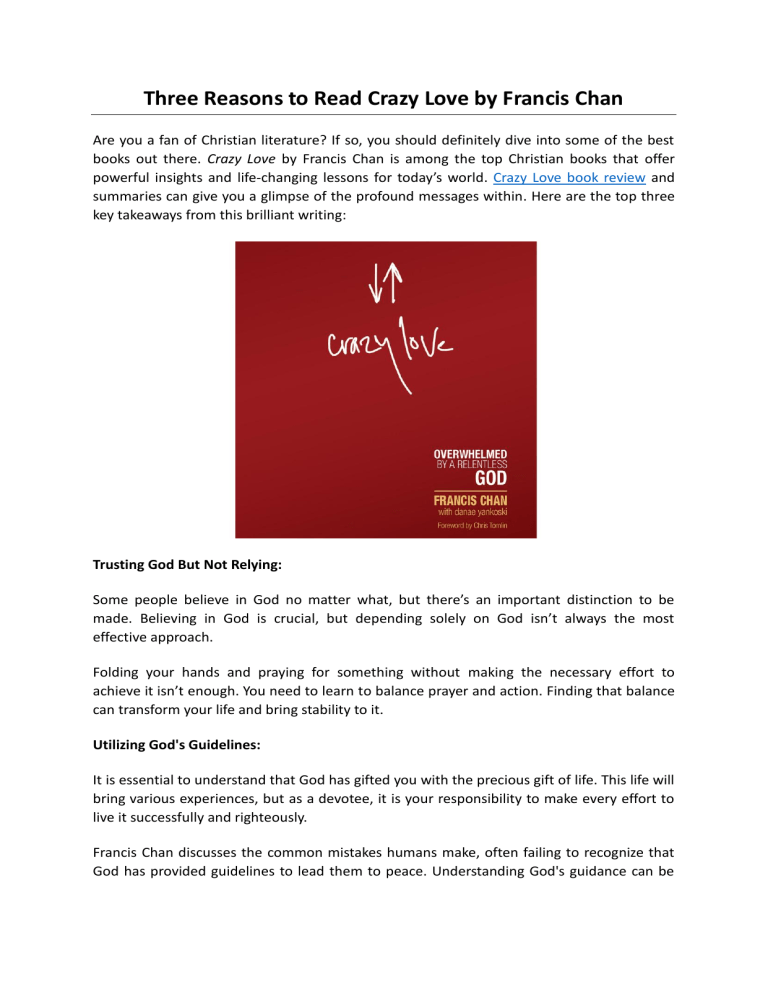 Three Reasons to Read Crazy Love by Francis Chan Are you a fan of Christian literature? If so, you should definitely dive into some of the best books out there. Crazy Love by Francis Chan is among the top Christian books that offer powerful insights and life-changing lessons for today’s world. Crazy Love book review and summaries can give you a glimpse of the profound messages within. Here are the top three key takeaways from this brilliant writing: Trusting God But Not Relying: Some people believe in God no matter what, but there’s an important distinction to be made. Believing in God is crucial, but depending solely on God isn’t always the most effective approach. Folding your hands and praying for something without making the necessary effort to achieve it isn’t enough. You need to learn to balance prayer and action. Finding that balance can transform your life and bring stability to it. Utilizing God's Guidelines: It is essential to understand that God has gifted you with the precious gift of life. This life will bring various experiences, but as a devotee, it is your responsibility to make every effort to live it successfully and righteously. Francis Chan discusses the common mistakes humans make, often failing to recognize that God has provided guidelines to lead them to peace. Understanding God's guidance can be challenging, but this book offers valuable insights to help one navigate the right path. This is one of the primary reasons to read it. Revealing the Love for God: Crazy Lover eveals the various aspects of life that people frequently prioritize, even though these aspects may not deserve the attention they garner. Human desires and attachment to material possessions do not lead to true fulfillment. Genuine peace and purpose stem from loving God. This book offers valuable insights intocultivatinga love for the divine. When one falls in love with the Almighty, worldly distractions lose their grip, and one gains the strength to overcome life's traumas and crises. If you're seeking a deeper connection and a new path to devotion, give this book a try and explore the transformative power of divine love. About Holy Reads: Holy Reads is one of the best platforms forreadinga summary of Crazy Love by Francis Chan. The app provides users access to many other Christian books that can help them define their devotion and life. So, check out this service now. Find more details at https://www.holyreads.blog/ Original Source: https://bit.ly/4gwTQ4O