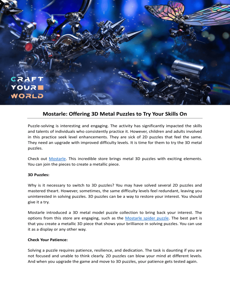 Mostarle: Offering 3D Metal Puzzles to Try Your Skills On Puzzle-solving is interesting and engaging. The activity has significantly impacted the skills and talents of individuals who consistently practice it. However, children and adults involved in this practice seek level enhancements. They are sick of 2D puzzles that feel the same. They need an upgrade with improved difficulty levels. It is time for them to try the 3D metal puzzles. Check out Mostarle. This incredible store brings metal 3D puzzles with exciting elements. You can join the pieces to create a metallic piece. 3D Puzzles: Why is it necessary to switch to 3D puzzles? You may have solved several 2D puzzles and mastered theart. However, sometimes, the same difficulty levels feel redundant, leaving you uninterested in solving puzzles. 3D puzzles can be a way to restore your interest. You should give it a try. Mostarle introduced a 3D metal model puzzle collection to bring back your interest. The options from this store are engaging, such as the Mostarle spider puzzle. The best part is that you create a metallic 3D piece that shows your brilliance in solving puzzles. You can use it as a display or any other way. Check Your Patience: Solving a puzzle requires patience, resilience, and dedication. The task is daunting if you are not focused and unable to think clearly. 2D puzzles can blow your mind at different levels. And when you upgrade the game and move to 3D puzzles, your patience gets tested again. Mostarle is here to test you as well. If you are a pro at solving puzzles, you should try these 3D puzzles. The puzzles from this store are difficult to handle. Every tiny piece has its place. You have to figure out where each one goes. You may lose your patience at times. However, consistency and meticulous attention can help you get greater results. The Irregular Arrangements: 2D pieces are still understandable. Firstly, you get those regular shapes that help you visualize the arrangement. This process simplifies 2D puzzle-solving. On the other hand, a 3D metal puzzle or Mostarle plasma ball kit isn't as easy. It may require more skills. Mostarle brings the finest 3D puzzles that can make your head spin. The tiny pieces may have multiple uses. As a result, you will fit it in the wrong place in the first attempt. But over time, you can get a hold of it and find the real use of the piece. Get a 3D metal puzzle from https://www.mostarle.com/ Original Source: https://bit.ly/4aULfYd