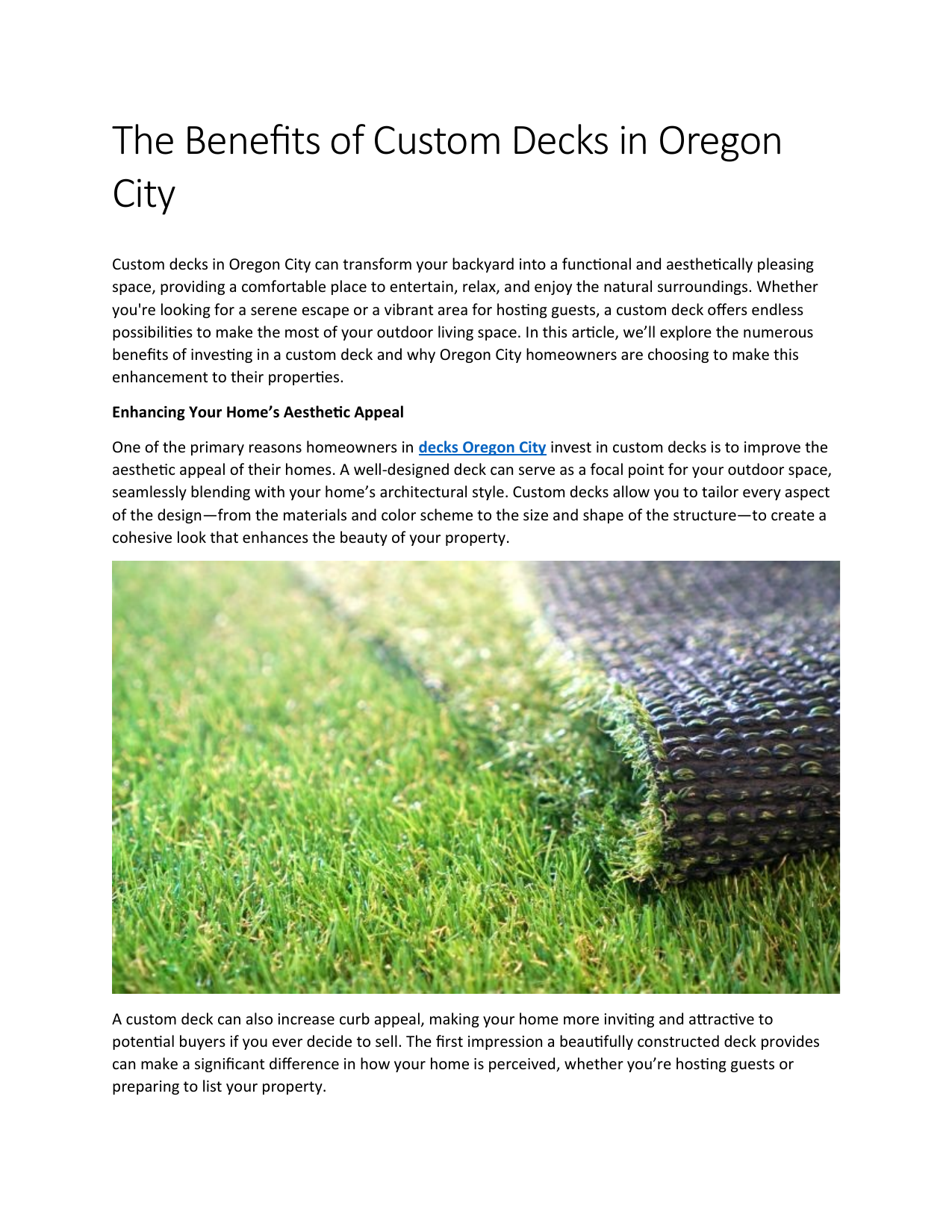 The Benefits of Custom Decks in Oregon City Custom decks in Oregon City can transform your backyard into a functional and aesthetically pleasing space, providing a comfortable place to entertain, relax, and enjoy the natural surroundings. Whether you're looking for a serene escape or a vibrant area for hosting guests, a custom deck offers endless possibilities to make the most of your outdoor living space. In this article, we’ll explore the numerous benefits of investing in a custom deck and why Oregon City homeowners are choosing to make this enhancement to their properties. Enhancing Your Home’s Aesthetic Appeal One of the primary reasons homeowners in decks Oregon City invest in custom decks is to improve the aesthetic appeal of their homes. A well-designed deck can serve as a focal point for your outdoor space, seamlessly blending with your home’s architectural style. Custom decks allow you to tailor every aspect of the design—from the materials and color scheme to the size and shape of the structure—to create a cohesive look that enhances the beauty of your property. A custom deck can also increase curb appeal, making your home more inviting and attractive to potential buyers if you ever decide to sell. The first impression a beautifully constructed deck provides can make a significant difference in how your home is perceived, whether you’re hosting guests or preparing to list your property. Maximizing Your Outdoor Living Space Custom decks are an excellent way to maximize your outdoor living space in Oregon City. Many homes in the area have beautiful backyards, but homeowners often don’t fully utilize these spaces. By building a deck, you can expand your living area into the outdoors and create a designated space for activities like dining, lounging, or grilling. If your yard is small or difficult to landscape, a custom deck can be an efficient and attractive solution. You can take advantage of vertical space by building a raised deck, or you can design a low-profile deck to keep the footprint minimal while still offering plenty of usable outdoor space. Increased Property Value Investing in a custom deck can significantly increase the value of your property. According to real estate experts, homes with well-designed outdoor living spaces, such as decks, tend to sell for more and attract more potential buyers. A custom deck can set your home apart from others on the market by showcasing the possibilities of outdoor living, which is increasingly popular among today’s homeowners. The return on investment (ROI) for a custom deck varies depending on the materials, design complexity, and size. However, most homeowners find that the added value of their home far exceeds the cost of building the deck. Customization and Personalization The beauty of a custom deck is that it allows you to fully customize and personalize the space according to your preferences. From the layout to the materials and finishing touches, you have the freedom to design a deck that fits your specific needs. You can choose the type of wood or composite material, the shape and size of the deck, and even add features like built-in seating, planters, lighting, and storage. This level of customization ensures that your deck is tailored to your lifestyle, making it the perfect space for your family’s activities. Whether you want a simple space for relaxation or a more elaborate area for entertaining, the possibilities are endless. Durability and Long-Term Investment Another significant advantage of custom decks is their durability. When you invest in high-quality materials and professional craftsmanship, you’re ensuring that your deck will stand the test of time. Whether you choose wood, composite, or PVC decking, a well-built custom deck can last for decades with minimal maintenance. This long-term investment can save you money on repairs and replacements down the line, providing you with a sturdy outdoor space that remains functional and beautiful for years. Additionally, materials like composite and PVC decking require less maintenance than traditional wood, freeing you from the time and expense of frequent staining, sealing, and cleaning. Versatility and Functionality A custom deck in Oregon City is not just a beautiful addition to your home; it also offers unparalleled versatility and functionality. Decks can be designed for a variety of uses, from dining areas and lounge spaces to outdoor kitchens and entertainment zones. With a custom design, you can integrate features like hot tubs, fire pits, or even a pergola to further enhance the functionality of your deck. Custom decks are also ideal for accommodating special needs, such as accessibility features for individuals with mobility challenges. By incorporating ramps, wider steps, or handrails into your deck design, you can create an inclusive outdoor space that works for everyone. Conclusion A custom deck in Oregon City offers a wide array of benefits, from enhancing your home’s aesthetic appeal and increasing property value to providing a functional and versatile outdoor living space. Whether you’re looking to create a peaceful retreat or a vibrant entertainment area, a custom deck is the perfect way to enhance your outdoor lifestyle. By working with experienced professionals and choosing the right materials, you can enjoy a beautiful, durable, and personalized deck that will provide years of enjoyment. For more updates and to explore their offerings, follow Turf Oregon City on social media: 🔹 Facebook: https://www.facebook.com/YorkOE 🔹 Twitter: https://twitter.com/York_OE 🔹 Instagram: https://www.instagram.com/york_outdoor_elements/ Upgrade your outdoor space today with Turf Oregon City!