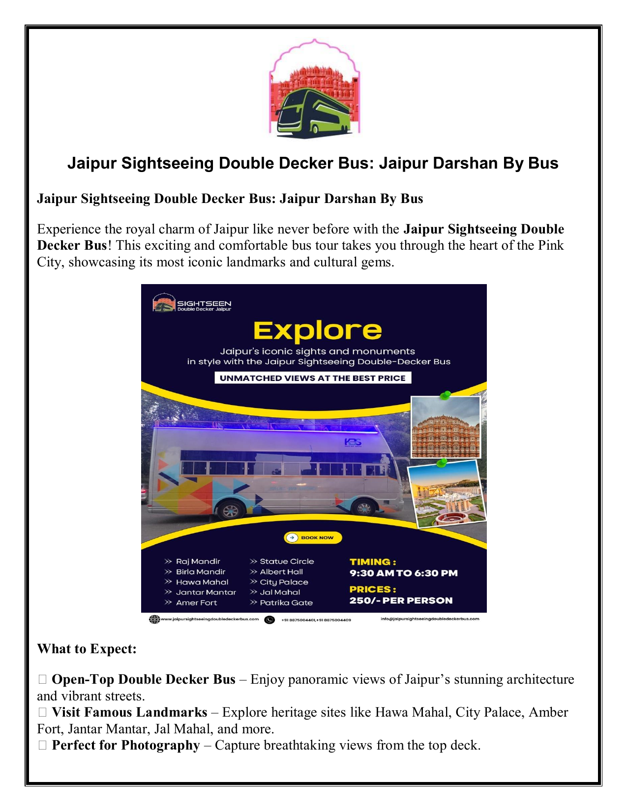 Jaipur Sightseeing Double Decker Bus: Jaipur Darshan By Bus Jaipur Sightseeing Double Decker Bus: Jaipur Darshan By Bus Experience the royal charm of Jaipur like never before with the Jaipur Sightseeing Double Decker Bus! This exciting and comfortable bus tour takes you through the heart of the Pink City, showcasing its most iconic landmarks and cultural gems. What to Expect: 🚌 Open-Top Double Decker Bus – Enjoy panoramic views of Jaipur’s stunning architecture and vibrant streets. 🚌 Visit Famous Landmarks – Explore heritage sites like Hawa Mahal, City Palace, Amber Fort, Jantar Mantar, Jal Mahal, and more. 🚌 Perfect for Photography – Capture breathtaking views from the top deck. 🚌 Live Commentary – Learn fascinating stories and historical facts from expert guides. 🚌 Convenient & Time-Saving – Hassle-free travel to multiple attractions in a single ride. Why Choose Jaipur Darshan by Bus?    Affordable and comfortable sightseeing experience Ideal for tourists, families, and solo travelers A unique way to explore Jaipur’s culture and history  Facebook - https://www.facebook.com/jaipursightseeingdoubledeckerbus  Instagram - https://www.instagram.com/jaipursightseeingdoubledecker/  Youtube - https://www.youtube.com/@JaipurSightseeingDoubleDecker  Home page - https://jaipursightseeingdoubledeckerbus.com/