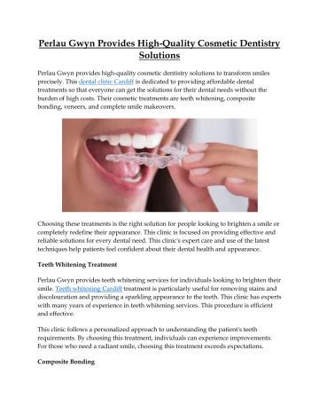Perlau Gwyn Provides High-Quality Cosmetic Dentistry Solutions Perlau Gwyn provides high-quality cosmetic dentistry solutions to transform smiles precisely. This dental clinic Cardiff is dedicated to providing affordable dental treatments so that everyone can get the solutions for their dental needs without the burden of high costs. Their cosmetic treatments are teeth whitening, composite bonding, veneers, and complete smile makeovers. Choosing these treatments is the right solution for people looking to brighten a smile or completely redefine their appearance. This clinic is focused on providing effective and reliable solutions for every dental need. This clinic's expert care and use of the latest techniques help patients feel confident about their dental health and appearance. Teeth Whitening Treatment Perlau Gwyn provides teeth whitening services for individuals looking to brighten their smile. Teeth whitening Cardiff treatment is particularly useful for removing stains and discolouration and providing a sparkling appearance to the teeth. This clinic has experts with many years of experience in teeth whitening services. This procedure is efficient and effective. This clinic follows a personalized approach to understanding the patient's teeth requirements. By choosing this treatment, individuals can experience improvements. For those who need a radiant smile, choosing this treatment exceeds expectations. Composite Bonding Perlau Gwyn offers composite bonding to fix teeth problems like cracks, gaps, or chips. This procedure involves the application of a tooth-colored resin. The best advantage of choosing this treatment at this clinic is that the process is quick and effective. This clinic handles the whole process carefully to provide the right solution for the teeth. Composite bonding at this clinic offers an immediate and reliable solution for those looking to fix their teeth' appearance with a natural look. Veneers: The Best Solution for Perfect Smiles Perlau Gwyn offers veneers as a comprehensive solution for transforming smiles. Expert dentist in Cardiff from this clinic attach custom-made shells to the front side of the teeth to provide a smooth and radiant finish. Veneers are the perfect solution for people with uneven teeth, severe discolouration, or misalignment. People can expect a natural and polished look that lasts for years with proper care by choosing this treatment. Experts from this clinic carefully handle this process to ensure that the veneer is perfectly suited to the individual needs. Choosing veneers at this clinic not only improves the aesthetic appeal of teeth but also boosts self-confidence. People can experience an impressive, long-lasting smile transformation by choosing this clinic. To get more details, visit https://www.perlaugwyndentalcare.co.uk/ Original Source: https://bit.ly/4hS5iZN