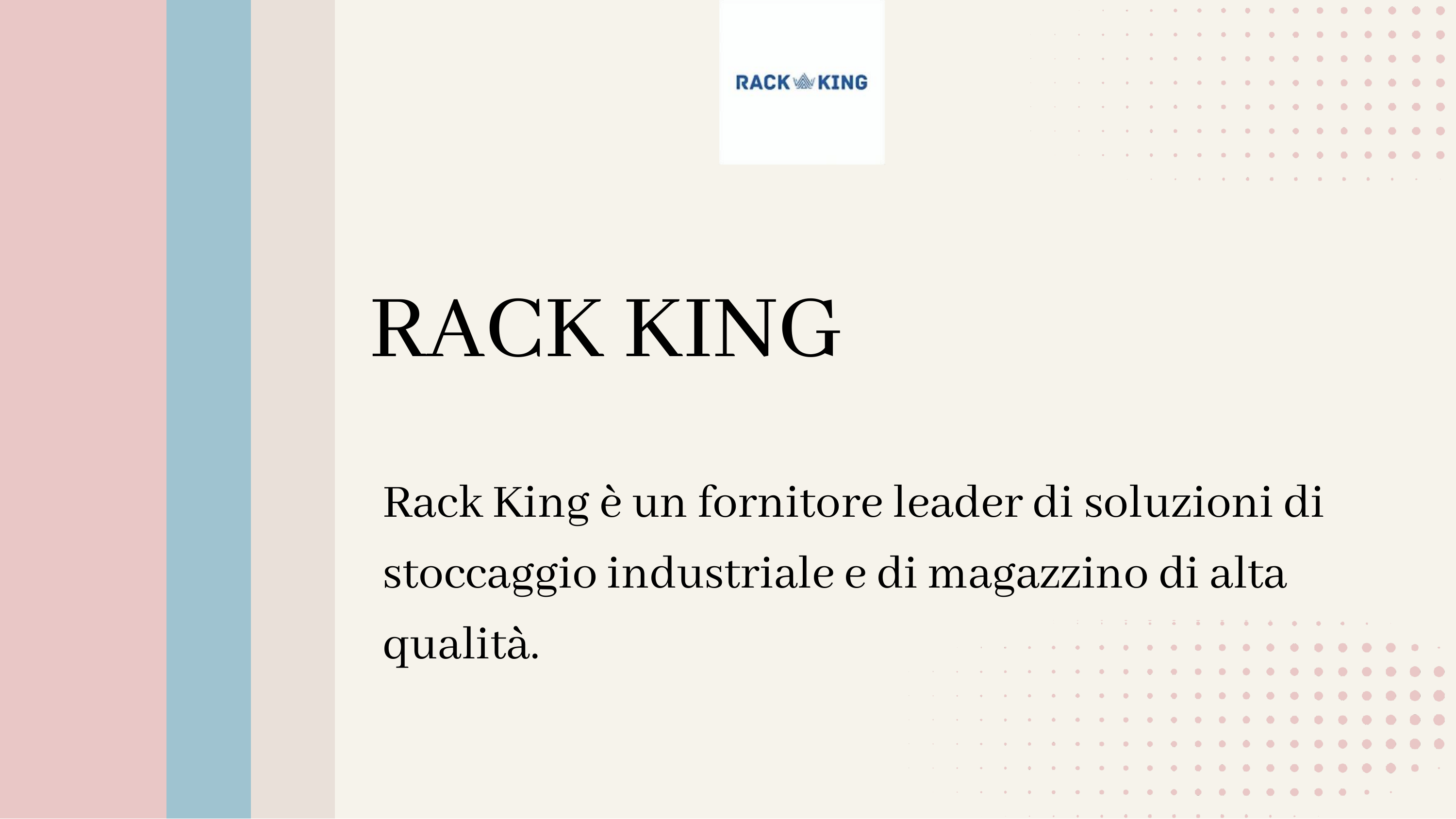 RACK KING Rack King è un fornitore leader di soluzioni di stoccaggio industriale e di magazzino di alta qualità. ASTRATTA :h 1 Rack King offre scaffali metallici di alta qualità e soluzioni di stoccaggio industriale progettate per la massima efficienza e organizzazione. Specializzata in scaffalature per pallet, scaffalature e sistemi di movimentazione dei materiali, Rack King offre soluzioni di stoccaggio durevoli e di alta qualità su misura per le varie esigenze di magazzino e aziendali. VANTAGGI DELLE SCAFFALATURE METALLICHE 1 5 Spazio di archiviazione massimizzatoOttimizza ogni centimetro del tuo spazio con scaffalature metalliche regolabili e ad alta capacità progettate per uno stoccaggio e un'organizzazione efficienti. 2 Maggiore durata e capacità di caricoProgettate con acciaio di alta qualità, le nostre scaffalature metalliche offrono una durata superiore e un'elevata capacità di carico, garantendo prestazioni di lunga duraProgettate con acciaio di alta qualità, le nostre scaffalature metalliche offrono una durata superiore e un'elevata capacità di carico GRAZIE 🌐 Sito web: https://www.rackking.it/