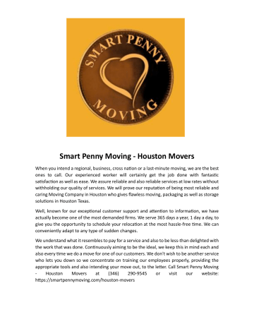 Smart Penny Moving - Houston Movers When you intend a regional, business, cross nation or a last-minute moving, we are the best ones to call. Our experienced worker will certainly get the job done with fantastic satisfaction as well as ease. We assure reliable and also reliable services at low rates without withholding our quality of services. We will prove our reputation of being most reliable and caring Moving Company in Houston who gives flawless moving, packaging as well as storage solutions in Houston Texas. Well, known for our exceptional customer support and attention to information, we have actually become one of the most demanded firms. We serve 365 days a year, 1 day a day, to give you the opportunity to schedule your relocation at the most hassle-free time. We can conveniently adapt to any type of sudden changes. We understand what it resembles to pay for a service and also to be less-than delighted with the work that was done. Continuously aiming to be the ideal, we keep this in mind each and also every time we do a move for one of our customers. We don't wish to be another service who lets you down so we concentrate on training our employees properly, providing the appropriate tools and also intending your move out, to the letter. Call Smart Penny Moving Houston Movers at (346) 290-9545 or visit our website: https://smartpennymoving.com/houston-movers
