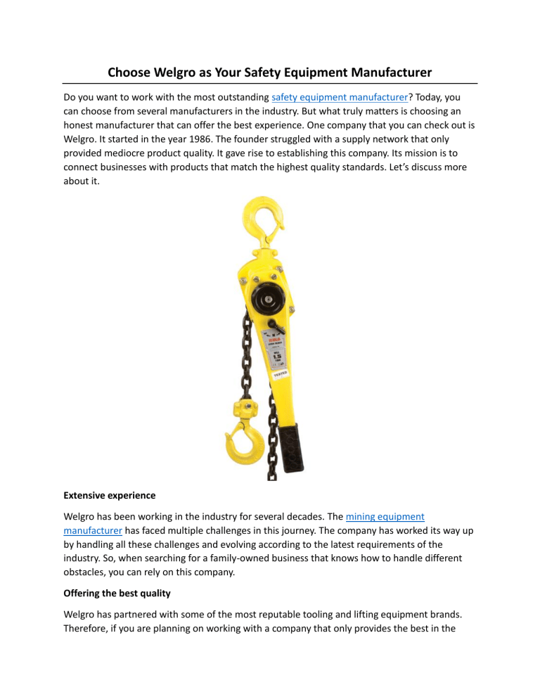 Choose Welgro as Your Safety Equipment Manufacturer Do you want to work with the most outstanding safety equipment manufacturer? Today, you can choose from several manufacturers in the industry. But what truly matters is choosing an honest manufacturer that can offer the best experience. One company that you can check out is Welgro. It started in the year 1986. The founder struggled with a supply network that only provided mediocre product quality. It gave rise to establishing this company. Its mission is to connect businesses with products that match the highest quality standards. Let’s discuss more about it. Extensive experience Welgro has been working in the industry for several decades. The mining equipment manufacturer has faced multiple challenges in this journey. The company has worked its way up by handling all these challenges and evolving according to the latest requirements of the industry. So, when searching for a family-owned business that knows how to handle different obstacles, you can rely on this company. Offering the best quality Welgro has partnered with some of the most reputable tooling and lifting equipment brands. Therefore, if you are planning on working with a company that only provides the best in the industry, you can never go wrong with this company. It will be your trusted partner throughout the journey. Service focused All the professionals at Welgro understand that the service helps them stay ahead of their competitors. Therefore, these professionals focus on offering the most exceptional service at all times. So, all the projects are completed within the decided timeline with this company. Therefore, your experience will always be unforgettable. A trusted name All the team members at Welgro have the right expertise required for delivering the best experience to all clients. These professionals have in-depth knowledge of different aspects and can guide you in the right direction according to your requirements. Hence, these experts can listen to your needs and advise you to match your preferences. Continuous improvement Welgro always stays focused on continuous improvement. All the team members work on becoming better every single day. Therefore, the solutions you find here will be better every single time. All these services will exceed your expectations. Hence, these professionals can work with honesty and provide you with the most convenient experience. If you are investing in lifting equipment or other mining equipment, look no further than Welgro. It will leave you stunned with the best solutions. To get more details, visit https://welgro.co.za/ Original Source: https://bit.ly/4kmBlTB