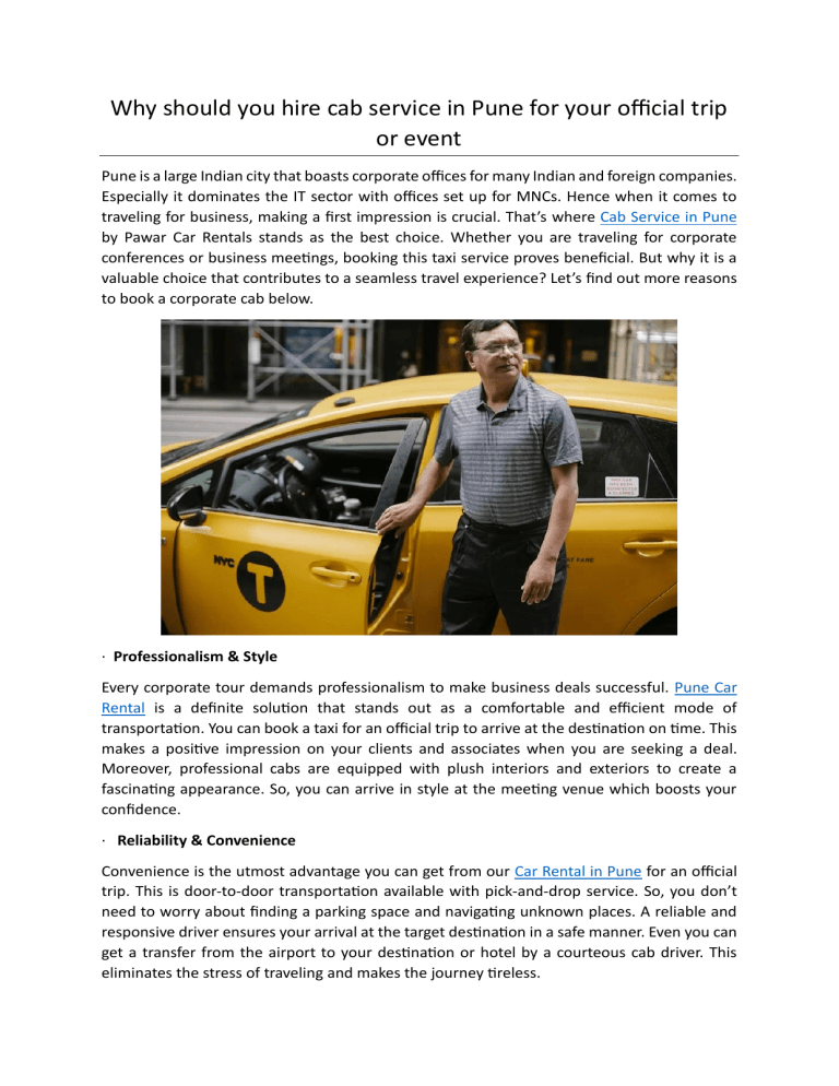 Why should you hire cab service in Pune for your official trip or event Pune is a large Indian city that boasts corporate offices for many Indian and foreign companies. Especially it dominates the IT sector with offices set up for MNCs. Hence when it comes to traveling for business, making a first impression is crucial. That’s where Cab Service in Pune by Pawar Car Rentals stands as the best choice. Whether you are traveling for corporate conferences or business meetings, booking this taxi service proves beneficial. But why it is a valuable choice that contributes to a seamless travel experience? Let’s find out more reasons to book a corporate cab below. · Professionalism & Style Every corporate tour demands professionalism to make business deals successful. Pune Car Rental is a definite solution that stands out as a comfortable and efficient mode of transportation. You can book a taxi for an official trip to arrive at the destination on time. This makes a positive impression on your clients and associates when you are seeking a deal. Moreover, professional cabs are equipped with plush interiors and exteriors to create a fascinating appearance. So, you can arrive in style at the meeting venue which boosts your confidence. · Reliability & Convenience Convenience is the utmost advantage you can get from our Car Rental in Pune for an official trip. This is door-to-door transportation available with pick-and-drop service. So, you don’t need to worry about finding a parking space and navigating unknown places. A reliable and responsive driver ensures your arrival at the target destination in a safe manner. Even you can get a transfer from the airport to your destination or hotel by a courteous cab driver. This eliminates the stress of traveling and makes the journey tireless. · Safety & Productivity Your productivity plays a crucial role in the success of the corporate trip. So, when you have a plan for an official trip, Pune Cab Service makes its pivotal contribution. By hiring a taxi, you can sit in the backseat to relax during travel. As you don’t have to navigate traffic, you can perform essential work-related tasks. Hence, you can reach at target destination refreshed and rejuvenated. Also, taxi is a safe mode of transportation as it is thoroughly cleaned and sanitized. · Flexible & Accessible Pune Car Rental in terms of flexibility is a great travel solution. You can book the cab in advance or can even get one on short notice. This is especially beneficial in case of an urgent meeting with a client or when you have to catch a flight. You can make an online booking in a few simple steps to get the cab to your doorstep. Moreover, the cab service is accessible 24x7 to keep you moving during the day and night for traveling. The final words Pawar Car Rentals offers the best Car Rental in Pune for businesses of all sizes. So, if you need a taxi for an official trip inside or outside Pune, reach us now. Make an online booking for a cab as per your travel schedule.