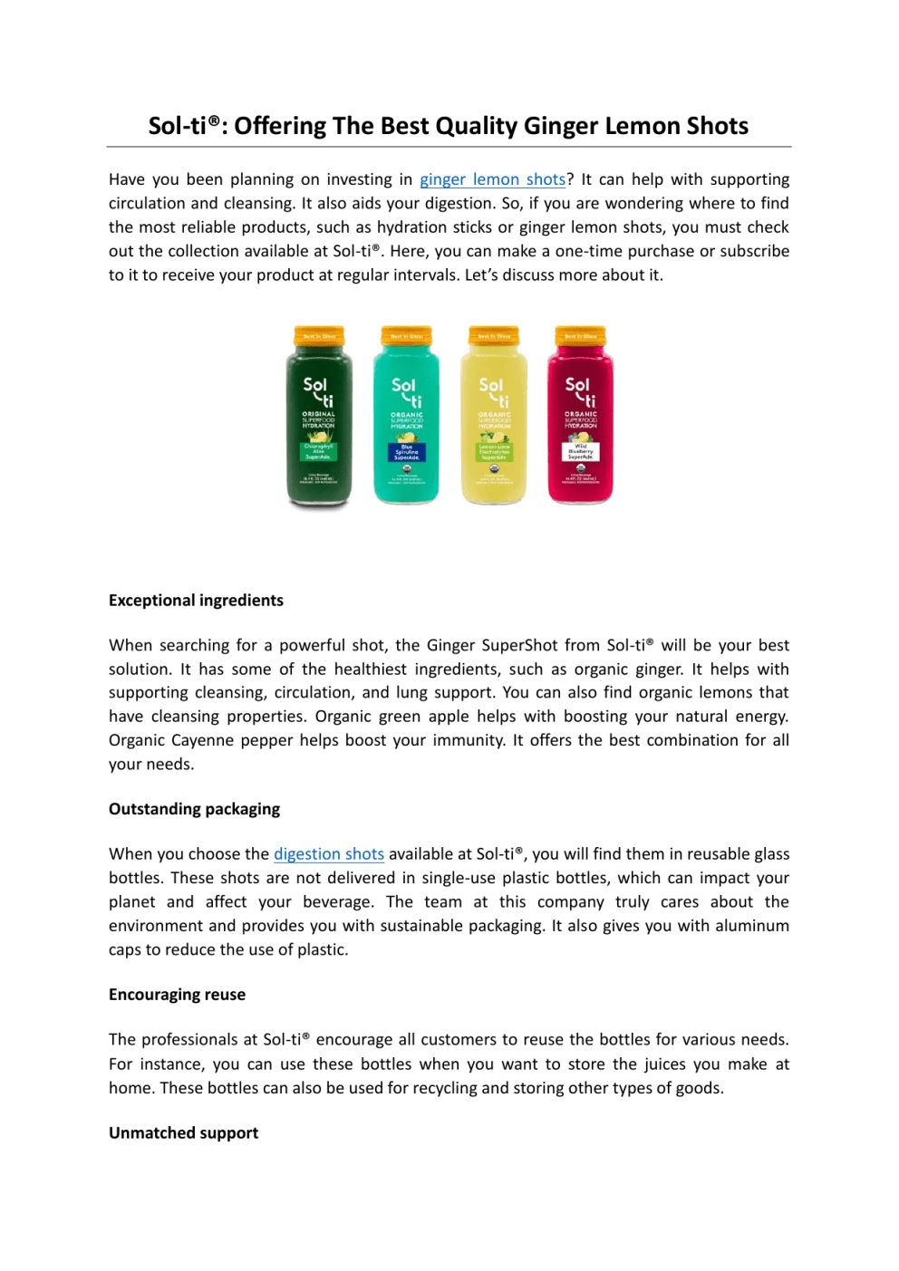 Sol-ti®: Offering The Best Quality Ginger Lemon Shots Have you been planning on investing in ginger lemon shots? It can help with supporting circulation and cleansing. It also aids your digestion. So, if you are wondering where to find the most reliable products, such as hydration sticks or ginger lemon shots, you must check out the collection available at Sol-ti®. Here, you can make a one-time purchase or subscribe to it to receive your product at regular intervals. Let’s discuss more about it. Exceptional ingredients When searching for a powerful shot, the Ginger SuperShot from Sol-ti® will be your best solution. It has some of the healthiest ingredients, such as organic ginger. It helps with supporting cleansing, circulation, and lung support. You can also find organic lemons that have cleansing properties. Organic green apple helps with boosting your natural energy. Organic Cayenne pepper helps boost your immunity. It offers the best combination for all your needs. Outstanding packaging When you choose the digestion shots available at Sol-ti®, you will find them in reusable glass bottles. These shots are not delivered in single-use plastic bottles, which can impact your planet and affect your beverage. The team at this company truly cares about the environment and provides you with sustainable packaging. It also gives you with aluminum caps to reduce the use of plastic. Encouraging reuse The professionals at Sol-ti® encourage all customers to reuse the bottles for various needs. For instance, you can use these bottles when you want to store the juices you make at home. These bottles can also be used for recycling and storing other types of goods. Unmatched support Sol-ti® provides excellent support to all customers. Hence, you can choose this company when you need help with different products. You can ask these professionals all your questions and queries before purchasing. So, you will have no doubts about your orders. Amazing payment options When you choose Sol-ti®, you can rest assured that the payment options will be completely safe. Therefore, you can place an order by trusting the transparent process at this company. You can also find some outstanding recipes on its website that you can work on. These organic and vegan products will help you notice various benefits. If you are looking for organic ginger shot, all you need to do is trust the options at Sol-ti®. This company will surely provide you with the best experience. To get more details, visit https://solti.com/ Original Source: https://bit.ly/3Xy5l5b