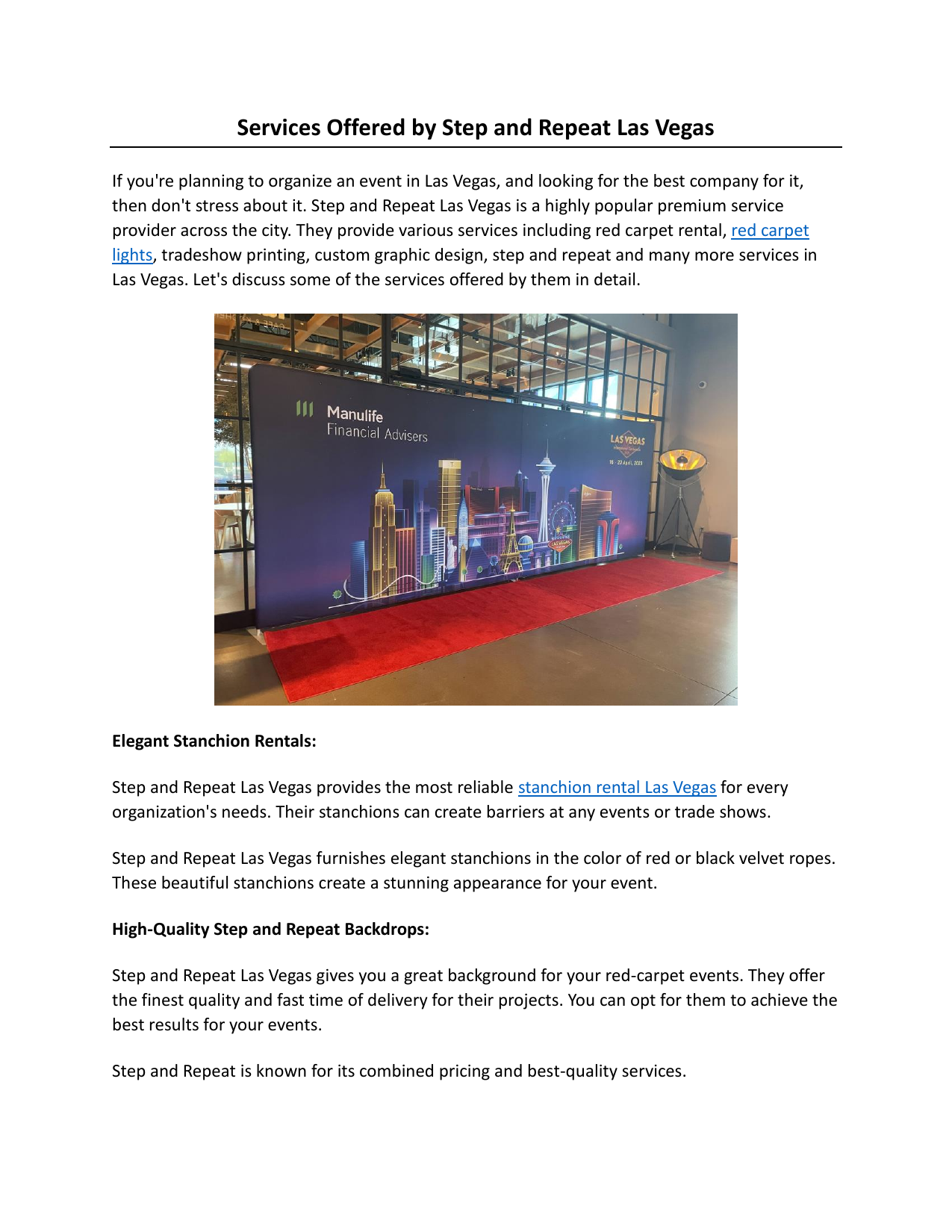 Services Offered by Step and Repeat Las Vegas If you're planning to organize an event in Las Vegas, and looking for the best company for it, then don't stress about it. Step and Repeat Las Vegas is a highly popular premium service provider across the city. They provide various services including red carpet rental, red carpet lights, tradeshow printing, custom graphic design, step and repeat and many more services in Las Vegas. Let's discuss some of the services offered by them in detail. Elegant Stanchion Rentals: Step and Repeat Las Vegas provides the most reliable stanchion rental Las Vegas for every organization's needs. Their stanchions can create barriers at any events or trade shows. Step and Repeat Las Vegas furnishes elegant stanchions in the color of red or black velvet ropes. These beautiful stanchions create a stunning appearance for your event. High-Quality Step and Repeat Backdrops: Step and Repeat Las Vegas gives you a great background for your red-carpet events. They offer the finest quality and fast time of delivery for their projects. You can opt for them to achieve the best results for your events. Step and Repeat is known for its combined pricing and best-quality services. Red Carpet Rentals: Step and Repeat Las Vegas offers you the finest and most elegant red carpet rentals Las Vegas for every type of event. They provide these services for both indoor and outdoor events, using carpets of various lengths and sizes. Step and Repeat can make your event more beautiful with the right looks. The red carpets from Step and Repeat Las Vegas have a length range from 10ft to 50 ft and also a width of 4ft and 6th. You can choose any carpet that suits your tastes. Step and Repeat Las Vegas also supplies red carpets for rentals at very budget-friendly options. They can deliver these carpets anywhere you want in Las Vegas. Expert Lighting and Photography: Step and Repeat Las Vegas also contributes to the most beautiful red carpet lighting designs for parties, events, business functions, weddings, and other special events. Their trained professionals have in-depth knowledge of lights. They provide lights that are non-reflective and create a stunning effect in photographs. The professional photographers at Step and Repeat Las Vegas work with the right and goodquality equipment. Their dedicated team has many years of experience, and they can capture the beautiful moments of your events at any time. You can blindly trust their professionals and service. To get more information about them, visit https://stepandrepeatlasvegas.com/ Original Source: https://bit.ly/3F54cMi