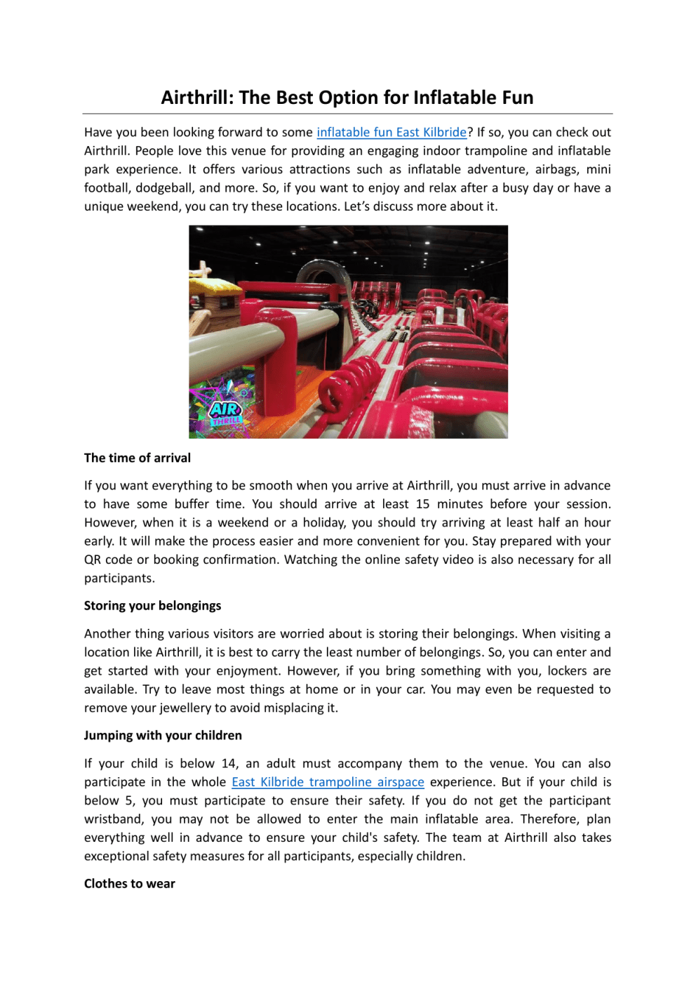 Airthrill: The Best Option for Inflatable Fun Have you been looking forward to some inflatable fun East Kilbride? If so, you can check out Airthrill. People love this venue for providing an engaging indoor trampoline and inflatable park experience. It offers various attractions such as inflatable adventure, airbags, mini football, dodgeball, and more. So, if you want to enjoy and relax after a busy day or have a unique weekend, you can try these locations. Let’s discuss more about it. The time of arrival If you want everything to be smooth when you arrive at Airthrill, you must arrive in advance to have some buffer time. You should arrive at least 15 minutes before your session. However, when it is a weekend or a holiday, you should try arriving at least half an hour early. It will make the process easier and more convenient for you. Stay prepared with your QR code or booking confirmation. Watching the online safety video is also necessary for all participants. Storing your belongings Another thing various visitors are worried about is storing their belongings. When visiting a location like Airthrill, it is best to carry the least number of belongings. So, you can enter and get started with your enjoyment. However, if you bring something with you, lockers are available. Try to leave most things at home or in your car. You may even be requested to remove your jewellery to avoid misplacing it. Jumping with your children If your child is below 14, an adult must accompany them to the venue. You can also participate in the whole East Kilbride trampoline airspace experience. But if your child is below 5, you must participate to ensure their safety. If you do not get the participant wristband, you may not be allowed to enter the main inflatable area. Therefore, plan everything well in advance to ensure your child's safety. The team at Airthrill also takes exceptional safety measures for all participants, especially children. Clothes to wear You should wear light clothes when excited about your experience at Airthrill. Activewear would be suitable for such a session. You should wear clothes that cover maximum skin to reduce the chances of friction burns. The socks offered here are compulsory for participation. If you are excited about visiting inflatable world East Kilbride, check out its website. Here, you will get the most unforgettable experience. You will be surprised by the effects. To get more details, visit https://airthrill.co.uk/ Original Source: https://bit.ly/41LCc99