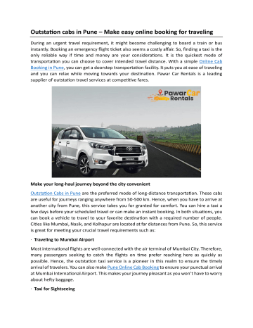Outstation cabs in Pune – Make easy online booking for traveling During an urgent travel requirement, it might become challenging to board a train or bus instantly. Booking an emergency flight ticket also seems a costly affair. So, finding a taxi is the only reliable way if time and money are your considerations. It is the quickest mode of transportation you can choose to cover intended travel distance. With a simple Online Cab Booking in Pune, you can get a doorstep transportation facility. It puts you at ease of traveling and you can relax while moving towards your destination. Pawar Car Rentals is a leading supplier of outstation travel services at competitive fares. Make your long-haul journey beyond the city convenient Outstation Cabs in Pune are the preferred mode of long-distance transportation. These cabs are useful for journeys ranging anywhere from 50-500 km. Hence, when you have to arrive at another city from Pune, this service takes you for granted for comfort. You can hire a taxi a few days before your scheduled travel or can make an instant booking. In both situations, you can book a vehicle to travel to your favorite destination with a required number of people. Cities like Mumbai, Nasik, and Kolhapur are located at far distances from Pune. So, this service is great for meeting your crucial travel requirements such as: · Traveling to Mumbai Airport Most international flights are well-connected with the air terminal of Mumbai City. Therefore, many passengers seeking to catch the flights on time prefer reaching here as quickly as possible. Hence, the outstation taxi service is a pioneer in this realm to ensure the timely arrival of travelers. You can also make Pune Online Cab Booking to ensure your punctual arrival at Mumbai International Airport. This makes your journey pleasant as you won’t have to worry about hefty baggage. · Taxi for Sightseeing You can also plan a day trip to various tourist places from Pune with your family or friends. Pune Outstation Cabs serves these travel needs with exceptional facilities for one-way or round trips. Places like Raigad, Matheran, Lonavala, and Khandala are famous among tourists. Hence, you can take a great trip to such places with an outstation taxi. This makes your weekend relaxed as you can enjoy leisure time with picturesque scenery. · Taxi for Official Tours Traveling outside Pune for official trips sounds tiring and overwhelming. But you can manage the hurdle well by using the advantage of outstation taxis. This service enables you to get the convenience of traveling long miles without feeling fatigued. Also, you can ensure a punctual arrival at the destination without any potential traffic obstacles. Also, when it comes to creating a good impression, a business taxi for outstation traveling is the ideal solution. The final words Pawar Car Rentals has a unique popularity for Outstation Cabs in Pune. We truly believe in valuing our customers by serving them instant, safe, and tailored travel solutions. Also, we keep our prices fixed and transparent so that you can check and compare online during booking.