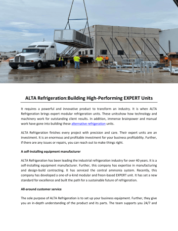 ALTA Refrigeration:Building High-Performing EXPERT Units It requires a powerful and innovative product to transform an industry. It is when ALTA Refrigeration brings expert modular refrigeration units. These unitsshow how technology and machinery work for outstanding client results. In addition, immense brainpower and manual work have gone into building these alternative refrigeration units. ALTA Refrigeration finishes every project with precision and care. Their expert units are an investment. It is an enormous and profitable investment for your business profitability. Further, if there are any issues or repairs, you can reach out to make things right. A self-installing equipment manufacturer ALTA Refrigeration has been leading the industrial refrigeration industry for over 40 years. It is a self-installing equipment manufacturer. Further, this company has expertise in manufacturing and design-build contracting. It has serviced the central ammonia system. Recently, this company has developed a one-of-a-kind modular and freon-based EXPERT unit. It has set a new standard for excellence and built the path for a sustainable future of refrigeration. All-around customer service The sole purpose of ALTA Refrigeration is to set up your business equipment. Further, they give you an in-depth understanding of the product and its parts. The team supports you 24/7 and offers extended warranties. This company has comprehensive solutions to every client's problem. Powered by innovation and technology Are you planning to invest in ALTA Refrigeration? It means you are choosing a custom refrigeration solution that stands the test of time. It uses the latest refrigeration technology and materials to build durable and efficient expert units. Further, the unit is engineered with reliable compressors and cooling systems. You do not have to worry about impromptu breakdowns or inefficient cooling. The innovative design of the units has unmatched longevity and performance. Hence, you can focus on your business. Maximum output and seamless integration Every business is unique. Hence, ALTA Refrigeration aims to build custom EXPERT units for your needs. It seamlessly integrates with your workflow and organization. Further, the team understands your concern and designs a solution to enhance your operations. You can specify your needs, such as high storage, specific temperature zones, or enhanced visibility for product access. ALTA Refrigeration believes in providing tailored units for your needs. Choose ALTA Refrigeration for self-efficient units! ALTA Refrigeration has reliable and transcritical co2 refrigeration system for your needs. You do not have to look further with the best refrigerator manufacturer in town.It helps your business run at peak performance with its custom refrigeration solutions. Choose ALTA Refrigeration for high-performing EXPERT units. To get more details, visit https://www.altarefrigeration.com/ Original source: https://bit.ly/41Hra3G