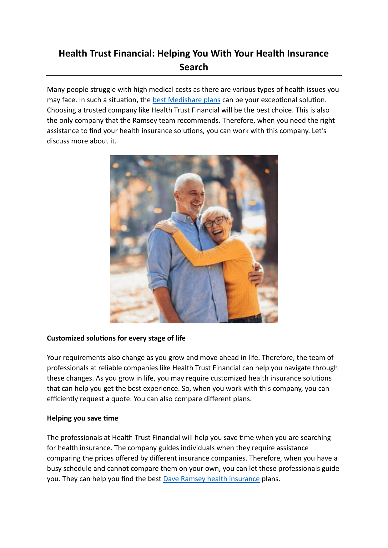 Health Trust Financial: Helping You With Your Health Insurance Search Many people struggle with high medical costs as there are various types of health issues you may face. In such a situation, the best Medishare plans can be your exceptional solution. Choosing a trusted company like Health Trust Financial will be the best choice. This is also the only company that the Ramsey team recommends. Therefore, when you need the right assistance to find your health insurance solutions, you can work with this company. Let’s discuss more about it. Customized solutions for every stage of life Your requirements also change as you grow and move ahead in life. Therefore, the team of professionals at reliable companies like Health Trust Financial can help you navigate through these changes. As you grow in life, you may require customized health insurance solutions that can help you get the best experience. So, when you work with this company, you can efficiently request a quote. You can also compare different plans. Helping you save time The professionals at Health Trust Financial will help you save time when you are searching for health insurance. The company guides individuals when they require assistance comparing the prices offered by different insurance companies. Therefore, when you have a busy schedule and cannot compare them on your own, you can let these professionals guide you. They can help you find the best Dave Ramsey health insurance plans. Boosting your confidence The team of specialists at Health Trust Financial knows that you may have various questions in mind when looking for an insurance plan. But when you have such a licensed agent, you will not have to worry about anything. These health insurance specialists can work on understanding your needs. They can guide you with every step in the journey. Therefore, you will never feel alone when you work with this company. Exceptional experience The team at Health Trust Financial has been working in this field for a long time. It specializes in health and term life insurance. It is one of the largest health savings account providers in the country. So, it has helped individuals and small businesses find solutions to various problems along the way. Therefore, when you are looking for the best services, it should be your preferred choice. If you are looking for Dave Ramsey Christian health insurance, contact the team at Health Trust Financial. It will be a perfect partner in the journey. To get more details, visit https://healthtrustfinancial.com/ Original Source: https://bit.ly/4kQBvTI