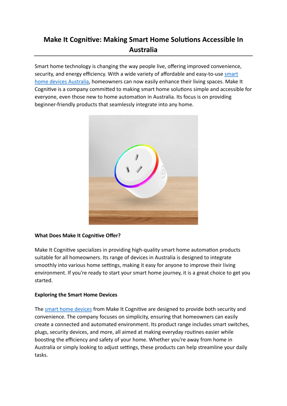 Make It Cognitive: Making Smart Home Solutions Accessible In Australia Smart home technology is changing the way people live, offering improved convenience, security, and energy efficiency. With a wide variety of affordable and easy-to-use smart home devices Australia, homeowners can now easily enhance their living spaces. Make It Cognitive is a company committed to making smart home solutions simple and accessible for everyone, even those new to home automation in Australia. Its focus is on providing beginner-friendly products that seamlessly integrate into any home. What Does Make It Cognitive Offer? Make It Cognitive specializes in providing high-quality smart home automation products suitable for all homeowners. Its range of devices in Australia is designed to integrate smoothly into various home settings, making it easy for anyone to improve their living environment. If you're ready to start your smart home journey, it is a great choice to get you started. Exploring the Smart Home Devices The smart home devices from Make It Cognitive are designed to provide both security and convenience. The company focuses on simplicity, ensuring that homeowners can easily create a connected and automated environment. Its product range includes smart switches, plugs, security devices, and more, all aimed at making everyday routines easier while boosting the efficiency and safety of your home. Whether you're away from home in Australia or simply looking to adjust settings, these products can help streamline your daily tasks. Why Choose Make It Cognitive? Make It Cognitive is an Australian-owned family business that prioritizes offering reliable, high-quality smart home products. Its devices meet Australian safety standards, ensuring a safe installation and operation process. Additionally, the company offers these products at competitive prices, making smart home solutions more affordable for everyone. What sets Make It Cognitive apart is the ease of use of its products. All devices are designed to be simple to set up and operate, so even those with limited technical experience can automate their home without difficulty. For anyone seeking a smarter, more efficient living space, this company provides the perfect starting point. Smart Fingerprint Door Lock One of the standout products from Make It Cognitive is its smart fingerprint door lock. This modern lock combines convenience and security by eliminating the need for traditional keys in Australia. Instead, it uses biometric fingerprint recognition to allow easy access, enhancing both the safety and ease of entry into your home. The sleek design and advanced security features make it a great choice for homeowners who want to embrace smart technology while keeping their property secure. Smart Switches Make It Cognitive also offers a range of smart light switches, which allow users to control their lighting with ease. These switches, including Zigbee-compatible options, let homeowners adjust the lighting in their homes remotely, creating the perfect atmosphere at any time. Not only do these switches provide convenience, but they also help save energy by optimizing usage in Australia. With low energy consumption and reliable connectivity, these smart switches ensure that lighting is both eco-friendly and cost-effective. If you're looking to enhance your home with ZigBee smart switch Australia, Make It Cognitive is an excellent choice. To start your smart home journey, visit https://www.makeitcognitive.com.au/ Original Source: https://bit.ly/4kqLIpy