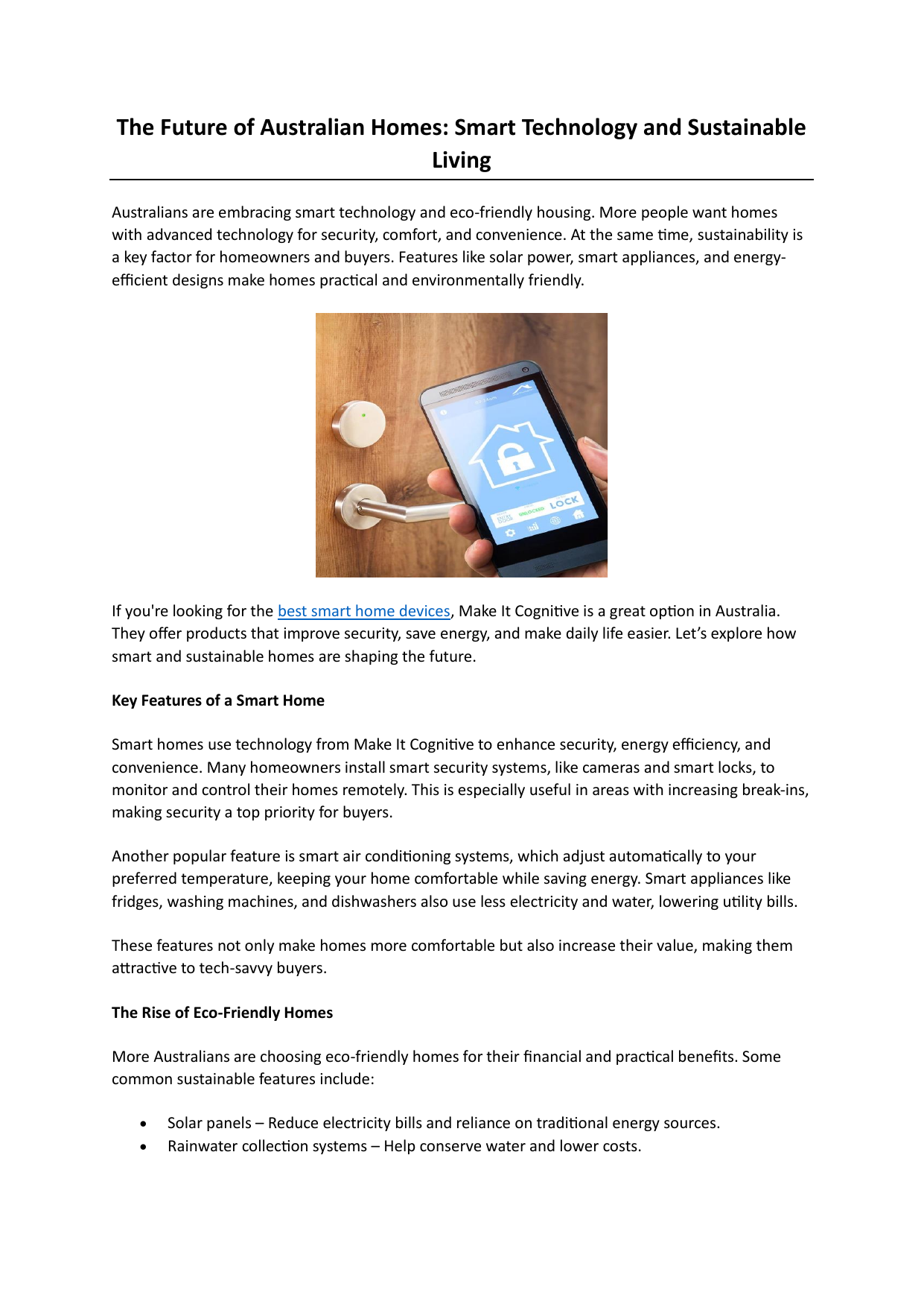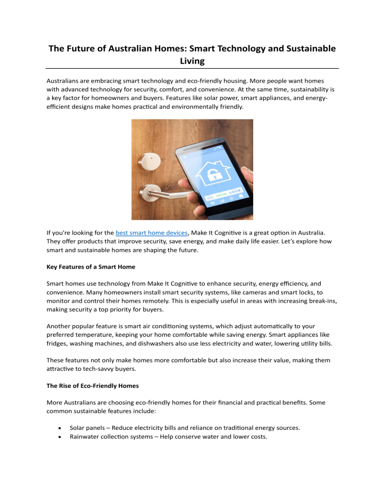 The Future of Australian Homes: Smart Technology and Sustainable Living Australians are embracing smart technology and eco-friendly housing. More people want homes with advanced technology for security, comfort, and convenience. At the same time, sustainability is a key factor for homeowners and buyers. Features like solar power, smart appliances, and energyefficient designs make homes practical and environmentally friendly. If you're looking for the best smart home devices, Make It Cognitive is a great option in Australia. They offer products that improve security, save energy, and make daily life easier. Let’s explore how smart and sustainable homes are shaping the future. Key Features of a Smart Home Smart homes use technology from Make It Cognitive to enhance security, energy efficiency, and convenience. Many homeowners install smart security systems, like cameras and smart locks, to monitor and control their homes remotely. This is especially useful in areas with increasing break-ins, making security a top priority for buyers. Another popular feature is smart air conditioning systems, which adjust automatically to your preferred temperature, keeping your home comfortable while saving energy. Smart appliances like fridges, washing machines, and dishwashers also use less electricity and water, lowering utility bills. These features not only make homes more comfortable but also increase their value, making them attractive to tech-savvy buyers. The Rise of Eco-Friendly Homes More Australians are choosing eco-friendly homes for their financial and practical benefits. Some common sustainable features include: • • Solar panels – Reduce electricity bills and reliance on traditional energy sources. Rainwater collection systems – Help conserve water and lower costs. • Better insulation and energy-efficient windows – Keep homes cooler in summer and warmer in winter, reducing energy use. Sustainable homes are becoming the new standard, helping homeowners save money while also protecting the environment. Opt for Make It Cognitive and get the most reliable services. Why Choose Smart and Sustainable Homes? Investing in smart and eco-friendly features offers several benefits: • • • • Lower Costs Over Time – While the initial setup can be expensive, these features save money on electricity and water bills in the long run. Higher Property Value – Modern, energy-efficient homes attract buyers and can sell for more. Better for the Environment – Reducing energy use and waste helps protect natural resources. Improved Living Conditions – Smart homes offer convenience and security, while sustainable homes provide cleaner air and better natural lighting. If you want smart devices Australia, Make It Cognitive offers high-quality products that enhance home security, energy efficiency, and comfort. The Future of Homes in Australia The real estate market is shifting towards smart and sustainable living. More buyers want homes that combine technology with eco-friendly solutions. Staying informed about these trends can help homeowners and investors make better choices while contributing to a greener future. Companies, like Make It Cognitive, play a key role in this transformation by offering smart home devices and solutions. They provide a variety of products, including the best Zigbee hub Australia, ensuring seamless home automation. Want to make your home smarter and more sustainable? Talk to the experts at Make It Cognitive to learn how you can upgrade your home with the latest smart technology. For more information, visit https://www.makeitcognitive.com.au/ and take the first step towards a smarter, greener home. Original Source: https://bit.ly/4bqPM4W