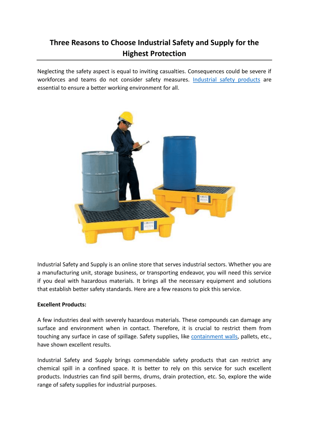 Three Reasons to Choose Industrial Safety and Supply for the Highest Protection Neglecting the safety aspect is equal to inviting casualties. Consequences could be severe if workforces and teams do not consider safety measures. Industrial safety products are essential to ensure a better working environment for all. Industrial Safety and Supply is an online store that serves industrial sectors. Whether you are a manufacturing unit, storage business, or transporting endeavor, you will need this service if you deal with hazardous materials. It brings all the necessary equipment and solutions that establish better safety standards. Here are a few reasons to pick this service. Excellent Products: A few industries deal with severely hazardous materials. These compounds can damage any surface and environment when in contact. Therefore, it is crucial to restrict them from touching any surface in case of spillage. Safety supplies, like containment walls, pallets, etc., have shown excellent results. Industrial Safety and Supply brings commendable safety products that can restrict any chemical spill in a confined space. It is better to rely on this service for such excellent products. Industries can find spill berms, drums, drain protection, etc. So, explore the wide range of safety supplies for industrial purposes. Price Benefits: Industrial supplies are always priced high due to their scale of operations. They serve a bigger purpose and should follow the highest safety standards. However, all these reasons contribute to the increased prices. However, there's always a way out of situations. Industrial Safety and Supply are the same. You can explore hundreds of safety products at this store. Additionally, you will observe reasonable prices for every product. This way, industries can fulfill their requirements at an excellent cost. Hence, this store is worth considering. Guaranteed Satisfaction: Low price is often associated with compromised quality. But this is not the case every time. Some providers have mastered the trait of offering high-quality products at excellent rates. Even an IBC spill containment pallet will be available for a few dollars. All you need to do is find the right seller in this vast market. Industrial Safety and Supply is the one you may need. It ensures the finest products and services. It guarantees user satisfaction through its products. You can check out the collection at this store and get everything needed. The durable and optimal products will simplify your job in the field. Browse their product range now. Check all the details at https://industrialandsafetysupply.com/ Original Source: https://bit.ly/3FAebJH