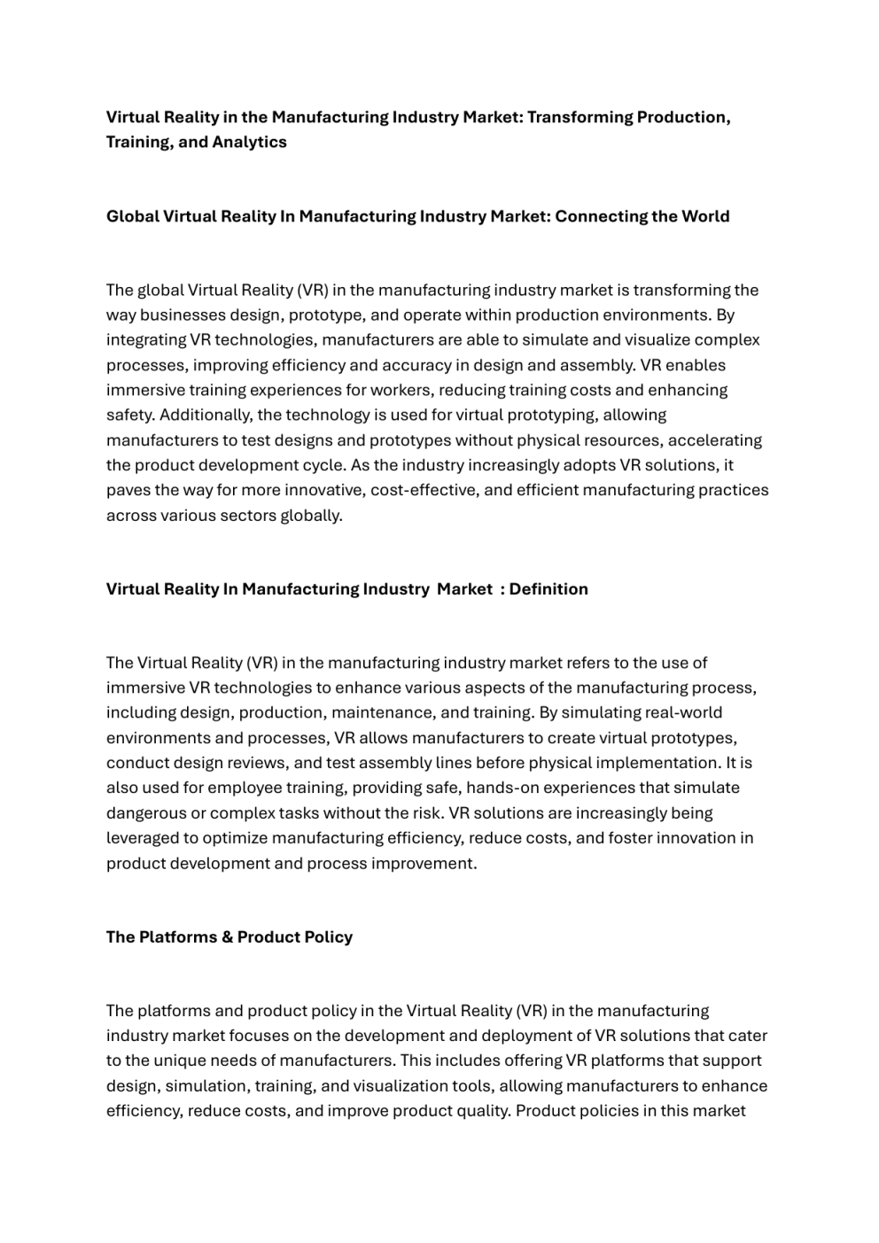 Virtual Reality in the Manufacturing Industry Market: Transforming Production, Training, and Analytics Global Virtual Reality In Manufacturing Industry Market: Connecting the World The global Virtual Reality (VR) in the manufacturing industry market is transforming the way businesses design, prototype, and operate within production environments. By integrating VR technologies, manufacturers are able to simulate and visualize complex processes, improving efficiency and accuracy in design and assembly. VR enables immersive training experiences for workers, reducing training costs and enhancing safety. Additionally, the technology is used for virtual prototyping, allowing manufacturers to test designs and prototypes without physical resources, accelerating the product development cycle. As the industry increasingly adopts VR solutions, it paves the way for more innovative, cost-effective, and efficient manufacturing practices across various sectors globally. Virtual Reality In Manufacturing Industry Market : Definition The Virtual Reality (VR) in the manufacturing industry market refers to the use of immersive VR technologies to enhance various aspects of the manufacturing process, including design, production, maintenance, and training. By simulating real-world environments and processes, VR allows manufacturers to create virtual prototypes, conduct design reviews, and test assembly lines before physical implementation. It is also used for employee training, providing safe, hands-on experiences that simulate dangerous or complex tasks without the risk. VR solutions are increasingly being leveraged to optimize manufacturing efficiency, reduce costs, and foster innovation in product development and process improvement. The Platforms & Product Policy The platforms and product policy in the Virtual Reality (VR) in the manufacturing industry market focuses on the development and deployment of VR solutions that cater to the unique needs of manufacturers. This includes offering VR platforms that support design, simulation, training, and visualization tools, allowing manufacturers to enhance efficiency, reduce costs, and improve product quality. Product policies in this market often emphasize interoperability, ease of integration with existing manufacturing systems, and scalability to accommodate growing industrial demands. Additionally, these policies address safety standards, data security, and regulatory compliance, ensuring that VR technologies adhere to industry-specific guidelines. Manufacturers and software developers are continually refining VR products to offer more immersive, accurate, and user-friendly solutions for various manufacturing applications. The Virtual Reality In Manufacturing Industry & Its Categories The Virtual Reality (VR) in the manufacturing industry is a rapidly evolving field that enhances various manufacturing processes through immersive digital experiences. Its categories include design and prototyping, where VR is used to visualize and test product designs in a virtual space before physical production; training and simulation, enabling workers to practice complex tasks in a safe, risk-free environment; and remote assistance, allowing experts to provide real-time guidance to workers on the factory floor via VR interfaces. Other key categories include process optimization, where VR aids in the simulation of production lines for efficiency improvements, and maintenance and repair, offering virtual diagnostics and step-by-step instructions for equipment servicing. These categories are reshaping the industry by improving productivity, reducing costs, and enhancing safety and innovation. Virtual Reality In Manufacturing Industry Connectivity Platforms Virtual Reality (VR) in the manufacturing industry is transforming production and training processes by providing immersive environments for workers and engineers to interact with machines, designs, and workflows. Connectivity platforms play a key role by linking VR systems to real-time data from equipment, sensors, and enterprise systems, enabling the creation of virtual replicas of production lines or entire factories. This integration allows manufacturers to conduct virtual simulations for process optimization, product design, and maintenance training. VR-based platforms also enable remote collaboration, allowing engineers to troubleshoot or optimize systems from anywhere. With seamless connectivity, VR enhances decision-making, reduces downtime, and improves safety by offering a risk-free space to test scenarios and train personnel. Virtual Reality In Manufacturing Industry Platforms Virtual Reality (VR) platforms in the manufacturing industry are revolutionizing how companies design, prototype, and train employees. These platforms enable the creation of immersive, 3D virtual environments that simulate real-world manufacturing processes, allowing engineers and workers to visualize and interact with product designs, assembly lines, and equipment before actual production begins. VR platforms are used for virtual prototyping, enabling quick adjustments to designs, reducing the need for physical prototypes, and shortening time-to-market. They also offer valuable training tools, allowing employees to practice tasks in a safe, controlled environment without the risk of damaging expensive equipment or creating safety hazards. Additionally, VR platforms facilitate remote collaboration, allowing teams across different locations to work together in a shared virtual space, improving productivity and decision-making in the manufacturing process. Virtual Reality In Manufacturing Industry Analytics Platforms Virtual Reality (VR) analytics platforms in the manufacturing industry are driving advanced data-driven decision-making by integrating VR with real-time data collection and analysis tools. These platforms allow manufacturers to visualize key performance metrics, such as production rates, machine health, and workflow efficiency, w