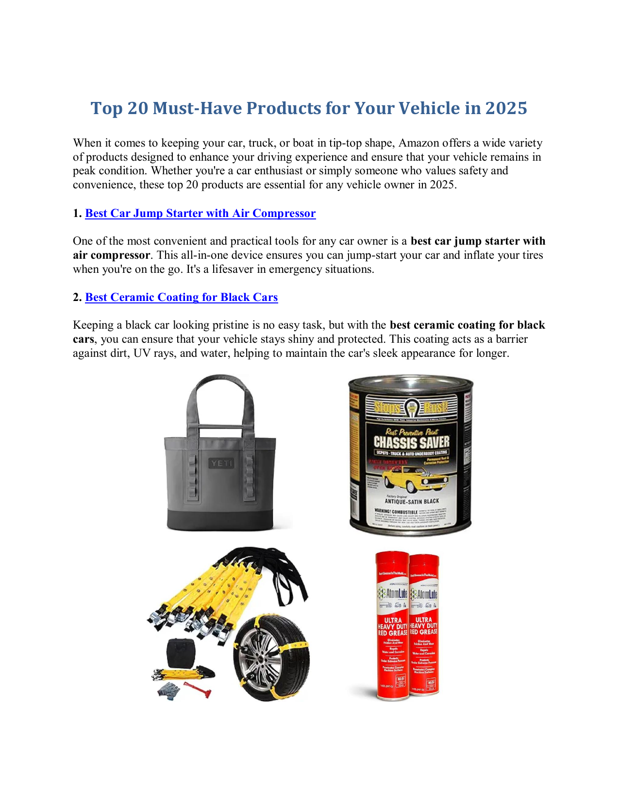 Top 20 Must-Have Products for Your Vehicle in 2025 When it comes to keeping your car, truck, or boat in tip-top shape, Amazon offers a wide variety of products designed to enhance your driving experience and ensure that your vehicle remains in peak condition. Whether you're a car enthusiast or simply someone who values safety and convenience, these top 20 products are essential for any vehicle owner in 2025. 1. Best Car Jump Starter with Air Compressor One of the most convenient and practical tools for any car owner is a best car jump starter with air compressor. This all-in-one device ensures you can jump-start your car and inflate your tires when you're on the go. It's a lifesaver in emergency situations. 2. Best Ceramic Coating for Black Cars Keeping a black car looking pristine is no easy task, but with the best ceramic coating for black cars, you can ensure that your vehicle stays shiny and protected. This coating acts as a barrier against dirt, UV rays, and water, helping to maintain the car's sleek appearance for longer. 3. Best Car Wax for UV Protection A good car wax for UV protection is essential for preserving the paint of your vehicle. It provides a protective layer against harmful UV rays, preventing fading and oxidation, while giving your car a glossy, smooth finish. 4. Best Car Wash Soap for Ceramic Coating If you have a ceramic-coated car, using the best car wash soap for ceramic coating is crucial. This type of soap is specially formulated to clean your car without damaging the protective coating, keeping it intact and effective. 5. Best Car Audio Battery For those who love a high-quality audio system, the best car audio battery provides the necessary power to support your sound system. A reliable battery ensures that your audio setup operates efficiently without draining your vehicle’s main battery. 6. Best Diesel Truck Diagnostic Scanner For diesel truck owners, having the best diesel truck diagnostic scanner is indispensable. This device helps you detect any engine or mechanical issues before they become serious, saving you time and money on repairs. 7. Best Cell Phone Booster for Truck Traveling long distances with weak cell reception can be frustrating. The best cell phone booster for truck amplifies the signal, allowing you to stay connected on the road, whether for business or leisure. 8. Best Car Gun Safes For those who carry firearms in their vehicles, a best car gun safe is crucial for both safety and convenience. These safes keep your firearms secure and easily accessible, ensuring that they are protected from unauthorized access. 9. Best Oil for Classic Cars Classic cars require special care, and using the best oil for classic cars ensures that their engines run smoothly. This high-quality oil helps preserve the engine’s performance and longevity. 10. Best Trolling Motor for Jon Boat Fishing enthusiasts will appreciate the best trolling motor for jon boat. This motor provides quiet and efficient operation, allowing you to navigate through waters without disturbing the fish. 11. Best Boat Battery Charger To keep your boat ready for the water, a best boat battery charger is essential. It ensures your boat’s battery stays fully charged, so you can enjoy a hassle-free outing on the water. 12. Best Truck Bed Liner Spray Protect your truck bed with the best truck bed liner spray. This durable coating prevents damage from scratches, dents, and rust, keeping your truck looking new for years. 13. Best Car Cover for Outside If you park your car outdoors, a best car cover for outside is a must. It shields your vehicle from the elements, including rain, snow, and harmful UV rays, ensuring it stays in top condition. 14. Best Lawn Care Products (Especially in Spring/Summer) For a well-maintained yard, the best lawn care products are indispensable. From fertilizers to weed control, these products help your lawn thrive during the spring and summer months. 15. Best Fire Extinguisher for Car Safety should always be a priority. The best fire extinguisher for car is compact and designed to handle vehicle fires, providing peace of mind in case of emergencies. 16. Best RC Car Battery Charger For hobbyists who enjoy RC cars, the best RC car battery charger is essential for keeping your vehicles powered up. This charger ensures a quick and efficient charge every time. 17. Best Sound Deadening Insulation for Cars The best sound deadening insulation for cars reduces road noise and vibrations, creating a quieter, more comfortable driving experience. It’s perfect for those who enjoy peaceful drives or have high-performance audio systems. 18. Best Truck Tires for Towing When towing heavy loads, the best truck tires for towing are crucial. These tires are designed to handle the added weight and ensure safety and stability while driving. 19. Best Train Horn for a Truck For a powerful and attention-grabbing sound, the best train horn for a truck is a must. Whether for fun or safety, this horn ensures that your presence on the road is noticed. 20. Best Boat Upholstery Cleaner Keep your boat’s interior looking fresh with the best boat upholstery cleaner. This product removes stains, dirt, and mildew, helping to maintain the comfort and appearance of your boat’s interior. With these 20 must-have products for 2025, you’ll be ready to enhance your vehicle’s performance, safety, and appearance. Whether you’re a car enthusiast or someone who simply wants to ensure their vehicle runs smoothly, these products will keep your ride in top shape. For more Details visit our website: https://reviewb4.com/ EMAIL:[email protected] PHONE NUMBER: 202-555-0188 LOCATION: 2360 Hood Avenue, San Diego, CA, 92123