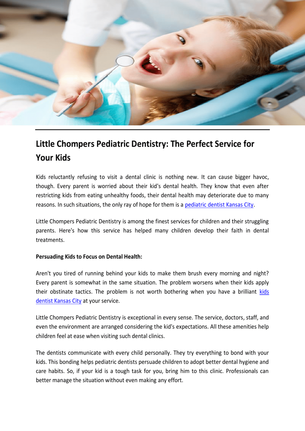 Little Chompers Pediatric Dentistry: The Perfect Service for Your Kids Kids reluctantly refusing to visit a dental clinic is nothing new. It can cause bigger havoc, though. Every parent is worried about their kid's dental health. They know that even after restricting kids from eating unhealthy foods, their dental health may deteriorate due to many reasons. In such situations, the only ray of hope for them is a pediatric dentist Kansas City. Little Chompers Pediatric Dentistry is among the finest services for children and their struggling parents. Here's how this service has helped many children develop their faith in dental treatments. Persuading Kids to Focus on Dental Health: Aren't you tired of running behind your kids to make them brush every morning and night? Every parent is somewhat in the same situation. The problem worsens when their kids apply their obstinate tactics. The problem is not worth bothering when you have a brilliant kids dentist Kansas City at your service. Little Chompers Pediatric Dentistry is exceptional in every sense. The service, doctors, staff, and even the environment are arranged considering the kid's expectations. All these amenities help children feel at ease when visiting such dental clinics. The dentists communicate with every child personally. They try everything to bond with your kids. This bonding helps pediatric dentists persuade children to adopt better dental hygiene and care habits. So, if your kid is a tough task for you, bring him to this clinic. Professionals can better manage the situation without even making any effort. Making Them Enjoy Their Sessions: Entertaining today's kids is probably the most challenging part. And when they know that they may see a doctor, they are extremely hard to handle. Children are brilliant at being defensive when something is going on out of their way. For instance, they make use of all the tactics to avoid going to dental clinics. Little Chompers Pediatric Dentistry can help every parent in such situations. The best childrens dentist Kansas City MO at this clinic will interact with the kids to help them find a reliable solution. But first, they put in effort to entertain kids. The pediatric dentists and staff try to make every session equally enjoyable for the kids. When this happens, kids will never refuse to visit Little Chompers Pediatric Dentistry. They would be eager about the next appointment and the fun experience at this clinic. Hence, it can impact your child's perspective on dental care. Check more about it at https://littlechomperspd.com/ Original Source: https://bit.ly/4l7VKMu