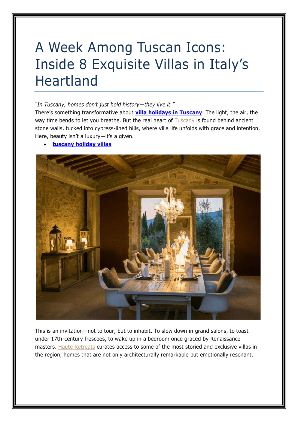 A Week Among Tuscan Icons: Inside 8 Exquisite Villas in Italy’s Heartland “In Tuscany, homes don’t just hold history—they live it.” There’s something transformative about villa holidays in Tuscany. The light, the air, the way time bends to let you breathe. But the real heart of Tuscany is found behind ancient stone walls, tucked into cypress-lined hills, where villa life unfolds with grace and intention. Here, beauty isn’t a luxury—it’s a given. tuscany holiday villas This is an invitation—not to tour, but to inhabit. To slow down in grand salons, to toast under 17th-century frescoes, to wake up in a bedroom once graced by Renaissance masters. Haute Retreats curates access to some of the most storied and exclusive villas in the region, homes that are not only architecturally remarkable but emotionally resonant. Below, a curated collection of villa holidays in Tuscany that do more than offer a place to stay. They offer a way to live—if only for a week—in harmony with history, elegance, and the art of quiet luxury. Villa Monte Mario, Cinigiano In the south of Tuscany, where the landscape softens into folds of vineyards and wild olive trees, Villa Monte Mario rises from the hills like a quietly whispered promise. With seven bedrooms, this residence doesn’t demand attention—it commands serenity. Designed for long lunches under vine-laced pergolas and sunrise yoga facing the valley, the villa adapts effortlessly to your rhythm. Here, groups gather not just to celebrate, but to reconnect. Incentive retreats, wellness escapes, even artist residencies—it’s a setting that doesn’t prescribe, only inspires. The infinity pool curves along the edge of a slope, drawing the horizon into your lap. A new sauna and gym will soon complete the wellness narrative, but even now, Villa Monte Mario offers all you need: quietude, comfort, and the kind of light that makes even silence feel rich. Book Villa MONTE MARIO La Tenuta, Grosseto If walls could speak, La Tenuta’s would tell stories in whispers and candlelight. Originally a cloister, this thousand-year-old sanctuary has been returned to its original poetry. Every stone is a relic, every timber beam a monument to patience. And yet, this is not a museum. It’s a living, breathing home where you walk barefoot through light-dappled courtyards, feeling both reverence and release. Surrounded by wild gardens sculpted from stone and wood, La Tenuta exists outside of time. It’s where nature writes the script and the architecture simply listens. BOOK NOW CLICK HERE Trionfante, Tavarnelle Val di Pesa Trionfante doesn’t so much announce itself as unfold slowly, like a great aria. You enter via eight garden steps and are immediately greeted by a home that understands restraint. There’s no flash here—only flow. A generous living room spills into a formal dining space with a noble fireplace, each room speaking softly in a palette of ash, cream, and earth. Restored original elements echo the past, while thoughtful modern design signals the present. Upstairs, time slows further. A reading lounge with a fireplace and quiet corners invites you to pause. Whether you arrive with friends, family, or simply yourself, Trionfante offers both company and solitude. As all great homes do. BOOK NOW CLICK HERE Villa Vita, Siena Villa Vita is a sensory dialogue between centuries. Each room is a curated experience—17thcentury oil paintings side by side with bright Uzbek ikat panels; antique heirlooms resting alongside steel-and-glass furniture by contemporary masters. Two living rooms and dual dining spaces are designed not just for gathering, but for expression. You’ll find conversations unfolding beneath 18th-century Parisian boiserie walls, meals served in spaces layered with velvet, linen, and silk. The kitchen, a professionalgrade stainless-steel marvel, feels more like a chef’s atelier than a home appliance. Villa Vita is not merely a backdrop for your stay—it’s a co-conspirator in it. BOOK NOW CLICK HERE Villa Zietta, Siena Some villas exist to impress. Villa Zietta simply welcomes. Minimalist in decor but abundant in warmth, this property is designed for ease. For barefoot breakfasts, sprawling family dinners, and kids darting through open archways into sunwarmed courtyards. Its generous layout makes it ideal for multigenerational stays and destination weddings alike. And while the beauty of the villa is quiet, it’s undeniably present—in the light that hits the stone walls just right at dusk, in the slow afternoons that stretch across the olive groves. Here, the luxury is space. Space to breathe, to gather, to celebrate. BOOK NOW CLICK HERE Villa Vitigliano, Greve in Chianti In the heart of Chianti, Villa Vitigliano feels more like a private estate than a rental property. With nine suites, all boasting king beds, en-suites, and private sitting rooms, it can house a full entourage without ever feeling crowded. The structure is classic Tuscan: archways, exposed beams, terracotta, and stone. But it’s also laced with modern indulgences: designer lighting, immersive sound systems, and deep soaking tubs. Vitigliano’s charm lies in its duality—it honors history while embracing modern comfort. Whether you’re sipping Brunello on the loggia or streaming opera through the villa-wide audio system, the experience is seamless. BOOK NOW CLICK HERE Villa Cetinale, Siena Some properties offer privacy. Cetinale offers majesty. Built in 1651, this estate has lived many lives—none of them ordinary. Today, it stands as one of the finest examples of Italian baroque architecture, yet it retains an intimate soul. Vaulted ceilings, trompe l’oeil frescoes, and towering windows frame the property’s verdant gardens and woodland beyond. It’s the kind of place where film scenes are set, where history is not recounted but reenacted. A full-time chef tends to your table, while two kitchens allow for both professional catering and impromp