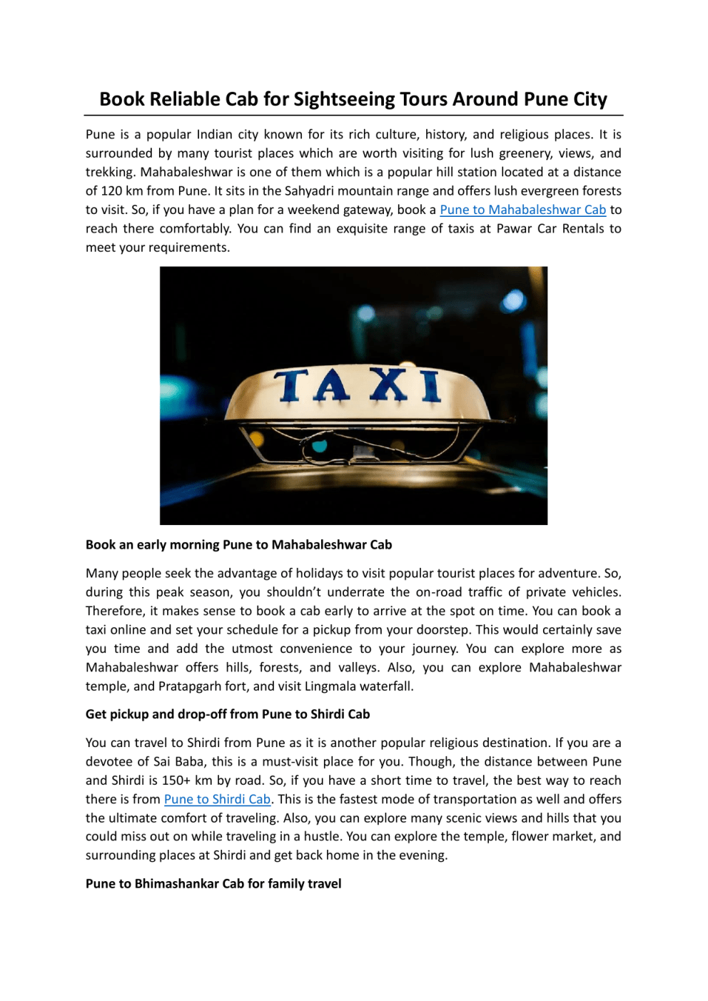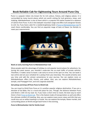 Book Reliable Cab for Sightseeing Tours Around Pune City Pune is a popular Indian city known for its rich culture, history, and religious places. It is surrounded by many tourist places which are worth visiting for lush greenery, views, and trekking. Mahabaleshwar is one of them which is a popular hill station located at a distance of 120 km from Pune. It sits in the Sahyadri mountain range and offers lush evergreen forests to visit. So, if you have a plan for a weekend gateway, book a Pune to Mahabaleshwar Cab to reach there comfortably. You can find an exquisite range of taxis at Pawar Car Rentals to meet your requirements. Book an early morning Pune to Mahabaleshwar Cab Many people seek the advantage of holidays to visit popular tourist places for adventure. So, during this peak season, you shouldn’t underrate the on-road traffic of private vehicles. Therefore, it makes sense to book a cab early to arrive at the spot on time. You can book a taxi online and set your schedule for a pickup from your doorstep. This would certainly save you time and add the utmost convenience to your journey. You can explore more as Mahabaleshwar offers hills, forests, and valleys. Also, you can explore Mahabaleshwar temple, and Pratapgarh fort, and visit Lingmala waterfall. Get pickup and drop-off from Pune to Shirdi Cab You can travel to Shirdi from Pune as it is another popular religious destination. If you are a devotee of Sai Baba, this is a must-visit place for you. Though, the distance between Pune and Shirdi is 150+ km by road. So, if you have a short time to travel, the best way to reach there is from Pune to Shirdi Cab. This is the fastest mode of transportation as well and offers the ultimate comfort of traveling. Also, you can explore many scenic views and hills that you could miss out on while traveling in a hustle. You can explore the temple, flower market, and surrounding places at Shirdi and get back home in the evening. Pune to Bhimashankar Cab for family travel Pay your respects to the Lord Shiva by visiting Bhimashankar Temple, a major Hindu religious place. It is one of the 12 jyotirlinga shrines of Lord Shiva (The Destructor). So, through a Pune to Bhimashankar Cab, you can visit here with your family. Visit the temple and surrounding sites to enjoy a calm and cool climate and spend your day devotedly. You can get doorstep pickup service from the cab and travel comfortably. The place is surrounded by dense Western Ghats forest and offers natural beauty to explore. The final words With Pawar Car Rentals, you can find an affordable Pune to Mahabaleshwar Cab to travel. We have a variety of taxis ranging from economical hatchbacks to sedans, and SUVs. So, depending on your travel needs, book the cab online and set the travel schedule with us. You get the best quality service and an experienced driver to make your travel experience unforgettable.