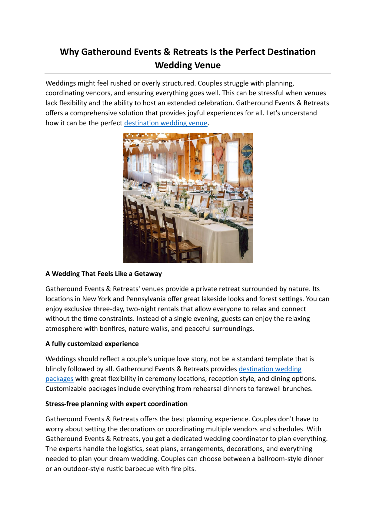 Why Gatheround Events & Retreats Is the Perfect Destination Wedding Venue Weddings might feel rushed or overly structured. Couples struggle with planning, coordinating vendors, and ensuring everything goes well. This can be stressful when venues lack flexibility and the ability to host an extended celebration. Gatheround Events & Retreats offers a comprehensive solution that provides joyful experiences for all. Let's understand how it can be the perfect destination wedding venue. A Wedding That Feels Like a Getaway Gatheround Events & Retreats' venues provide a private retreat surrounded by nature. Its locations in New York and Pennsylvania offer great lakeside looks and forest settings. You can enjoy exclusive three-day, two-night rentals that allow everyone to relax and connect without the time constraints. Instead of a single evening, guests can enjoy the relaxing atmosphere with bonfires, nature walks, and peaceful surroundings. A fully customized experience Weddings should reflect a couple's unique love story, not be a standard template that is blindly followed by all. Gatheround Events & Retreats provides destination wedding packages with great flexibility in ceremony locations, reception style, and dining options. Customizable packages include everything from rehearsal dinners to farewell brunches. Stress-free planning with expert coordination Gatheround Events & Retreats offers the best planning experience. Couples don't have to worry about setting the decorations or coordinating multiple vendors and schedules. With Gatheround Events & Retreats, you get a dedicated wedding coordinator to plan everything. The experts handle the logistics, seat plans, arrangements, decorations, and everything needed to plan your dream wedding. Couples can choose between a ballroom-style dinner or an outdoor-style rustic barbecue with fire pits. Scenic beauty meets modern comfort. Gatheround Events & Retreats combines natural beauty with high-quality accommodations. Its wedding venues are situated in locations that offer stunning views of natural beauty. The lodging includes cozy cabins and luxury sites. The guests can stay on-site and enjoy the natural beauty. Facilities provide relaxation areas, bridal suites, and spaces for wedding and pre-wedding preparations. A wedding that feels like forever Gatheround Events & Retreats offers an experience that you would want to return to. The experience extends to just a single stage. Guests and couples feel truly special when they are at the wedding venue. And the wedding photos are magical. The warmth of the moments, the campfire, and the food—everything is much enjoyed by the guests. They always recall the experience and the unforgettable moments they shared with their loved ones. The serene setting of the forest and the intimacy offered by a lakeside ceremony build memories that last forever. If you are looking for Catskills wedding venues, contact Gatheround Events & Retreats today to discuss more details! For more information, visit https://www.Gatheround Events & Retreatsus.com/ Original Source: https://bit.ly/4i3JvOs
