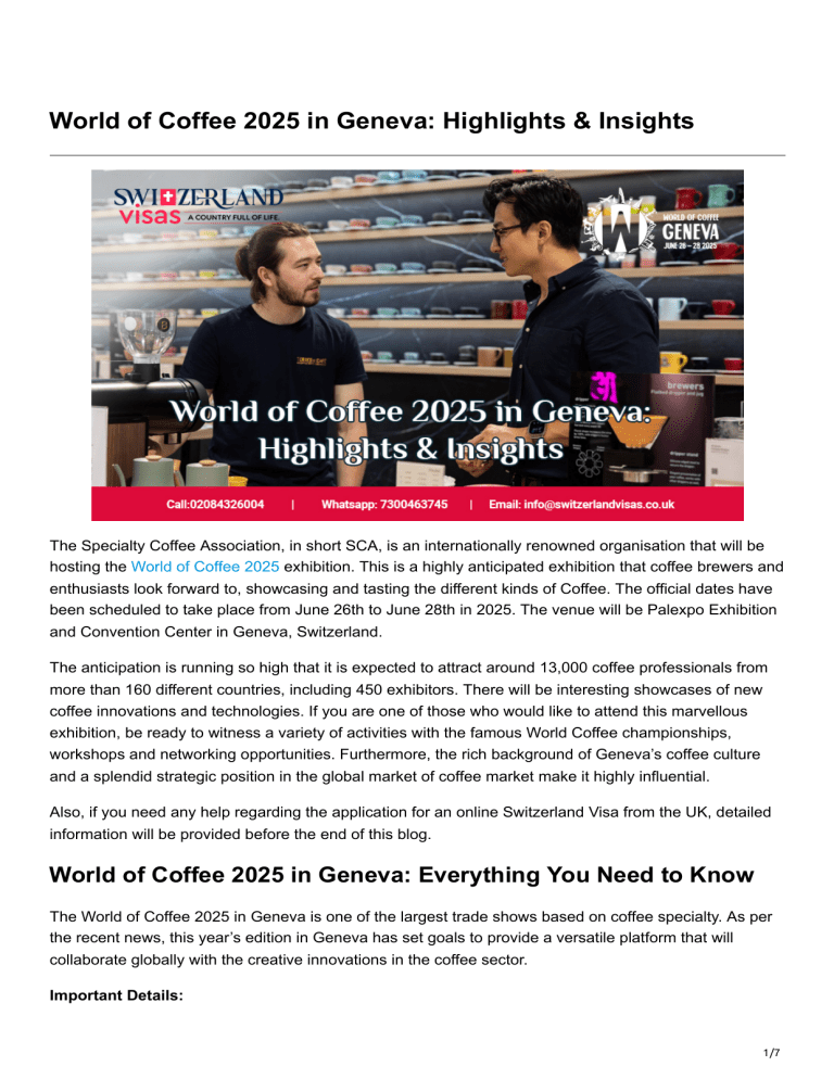 World of Coffee 2025 in Geneva: Highlights & Insights The Specialty Coffee Association, in short SCA, is an internationally renowned organisation that will be hosting the World of Coffee 2025 exhibition. This is a highly anticipated exhibition that coffee brewers and enthusiasts look forward to, showcasing and tasting the different kinds of Coffee. The official dates have been scheduled to take place from June 26th to June 28th in 2025. The venue will be Palexpo Exhibition and Convention Center in Geneva, Switzerland. The anticipation is running so high that it is expected to attract around 13,000 coffee professionals from more than 160 different countries, including 450 exhibitors. There will be interesting showcases of new coffee innovations and technologies. If you are one of those who would like to attend this marvellous exhibition, be ready to witness a variety of activities with the famous World Coffee championships, workshops and networking opportunities. Furthermore, the rich background of Geneva’s coffee culture and a splendid strategic position in the global market of coffee market make it highly influential. Also, if you need any help regarding the application for an online Switzerland Visa from the UK, detailed information will be provided before the end of this blog. World of Coffee 2025 in Geneva: Everything You Need to Know The World of Coffee 2025 in Geneva is one of the largest trade shows based on coffee specialty. As per the recent news, this year’s edition in Geneva has set goals to provide a versatile platform that will collaborate globally with the creative innovations in the coffee sector. Important Details: 1/7 Dates of Exhibition: June 26th to June 28th, 2025. Venue of Exhibition: Palexpo Exhibition and Convention Center, Geneva, Switzerland. Expected Attendance: Around 13,000 coffee professionals coming from more than 160 countries. Expected Exhibitors: Approximately 430 exhibitors, which will include manufacturers, roasters and innovators. A Complete Travel Guide to the World of Coffee 2025 Festival in Geneva This segment is for those who are coming to attend World of Coffee 2025 in Geneva for the first time. We will provide enough details that will help you reach the location, find proper accommodations, and provide a few insights on how you can explore Geneva in your free time after the exhibition. How to reach Palexpo: Geneva is itself a great location with a strategic advantage right in the centre of Europe. This gives an advantage for easy access to international travelers. In addition to that, the Palexpo Exhibition and Convention Center is also conveniently located near the Geneva International Airport. There are plenty of hassle-free connectivity options for attendees to reach the venue. Convenient ways to reach Palexpo from the Airport: Line 23 Bus/Line 5 Bus: This is the cheapest way to reach Palexpo, taking around 6 mins. Taxi: If you are travelling with family and holding a lot of items of luggage, then prefer this mode of transportation, which can get you reach by 2 mins. Towncar: For some premium transportation options, prefer the Towncar, which takes you to your destination in 2 mins. Walk: If you are travelling solo and don’t have much luggage to carry, then reach your destination on foot within 16 minutes. 2/7 Where to stay in Palexpo: Geneva has a diverse range of staying options, which will help you choose the perfect option based on your budget. Tip: We recommend that you book the hotels as early as possible so that you get the best deals and the best hotels to stay in the proximity. A few of the notable mentions are: Budget-Friendly: If you are looking for some place affordable and is right opposite to Palexpo, with Geneva Airport few minutes way, then keep Ibis Budget Geneve Palexpo Aeroport in your itinerary. Mid-Range: This range is preferable for those who are travelling with their families or friends and would require spacious rooms with many modern amenities. The Adina Apartment Hotel Geneva is the best option, which will even let you avail of a fitness center and free Wi-Fi. Luxury: For an absolute premium experience, we recommend booking the Hotel Bristol in central Geneva. It offers absolutely elegant rooms and is around 1.9 miles away from Palexpo. Read More: https://www.germanyvisa.co.uk/blog/easter-traditions-in-germany-festivals-markets-events/ What to Explore in Geneva? Geneva is an astounding city that will surely offer you a rich cultural experience. Make an experience of World of Coffee 2025 spectacular by visiting these important landmarks in Geneva: Jet d’Eau: This is one of the iconic water fountains on Lake Geneva that is must see place. Old Town or Vieille Ville: If you have some time on hand, then take a stroll around the cobbled streets vehicle viewing the historic buildings and enjoying snacks in cafes nearby. St. Pierre Cathedral: This is a magnificent tower from which you can get a great view of the city. Palais des Nations: The world-famous European headquarters of the UN. Guided tours are also available. Patek Philippe Museum: Witness the legacy of watchmaking in Geneva. Parc des Bastions: This is a great place to relax between the statues and the Reformation Wall. Lake Geneva Cruises: Mesmerize your mind with the nearby boat rides and marvellous views of Mont Blanc. Why You Shouldn’t Miss the World of Coffee 2025 in Geneva, Switzerland? The World of Coffee 2025 in Geneva is a must-visit opportunity for people who are enthusiastic about coffee and treat it with the level of professionalism. Some of the reasons we find compelling are: 3/7 Premier Industry Gathering: The exhibition is considered to a largest specialty coffee trade show. It is opportunity for the professionals to gather around and enhance there networking and business opportunities. Large Scale Exhibitions: With the presence of 450 exhibitors, one will get as splendid chance to know about latest innovations and products that will shape th