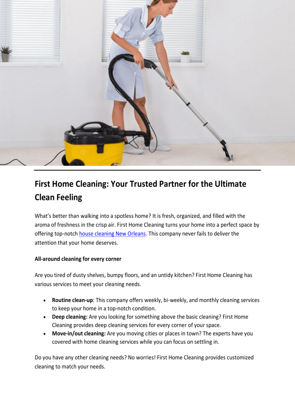 First Home Cleaning: Your Trusted Partner for the Ultimate Clean Feeling What’s better than walking into a spotless home? It is fresh, organized, and filled with the aroma of freshness in the crisp air. First Home Cleaning turns your home into a perfect space by offering top-notch house cleaning New Orleans. This company never fails to deliver the attention that your home deserves. All-around cleaning for every corner Are you tired of dusty shelves, bumpy floors, and an untidy kitchen? First Home Cleaning has various services to meet your cleaning needs. Routine clean-up: This company offers weekly, bi-weekly, and monthly cleaning services to keep your home in a top-notch condition. Deep cleaning: Are you looking for something above the basic cleaning? First Home Cleaning provides deep cleaning services for every corner of your space. Move-in/out cleaning: Are you moving cities or places in town? The experts have you covered with home cleaning services while you can focus on settling in. Do you have any other cleaning needs? No worries! First Home Cleaning provides customized cleaning to match your needs. Why First Home Cleaning? Highly reliable and professional: The team is an expert in cleaning and shows up on time to get the job done professionally. Sustainable products: First Home Cleaning cares about the planet and your health. Hence, it brings only eco-friendly and non-toxic cleaning substances for home and window cleaning New Orleans. Affordable & transparent: Do not worry about hidden fees or extra charges. This company offers high-quality cleaning at reasonable prices without any additional charges. Flexible schedule: First Home Cleaning understands your tight schedule and offers services at your preferred time. The cleaning professionals take pride in converting your home into a squeaky-clean sanctuary. The team respects your property and ensures it looks as good as new. Give a call for a clean home! A spotless home is just a call away with First Home Cleaning. The team is determined to deliver exceptional services and exceed your expectations. Call them for a routine clean-up or a deep cleaning. Experts are here at your rescue! So, are you ready to experience First Home Cleaning results? It is the best cleaning company New Orleans for comprehensive home cleaning services. Contact them for a no-obligation estimate, and let the team give you a sparkling home. Regular maintenance or one-time deep cleaning, First Home Cleaning gives your home the best care. To get more details, visit https://www.firsthomecleaning.com/ Original Source: https://bit.ly/3RZhpJq