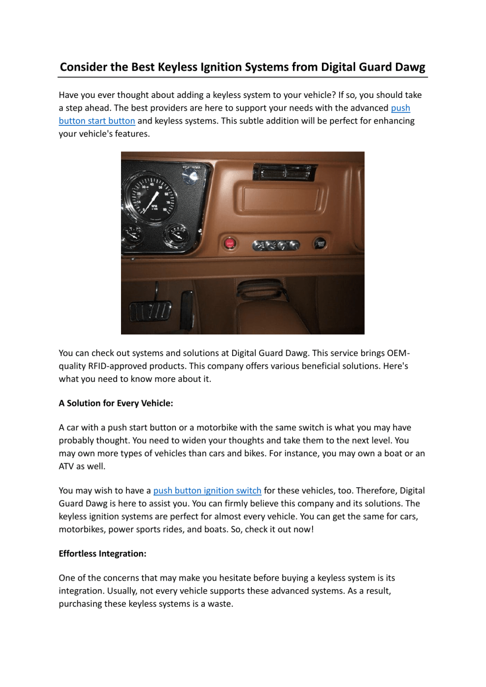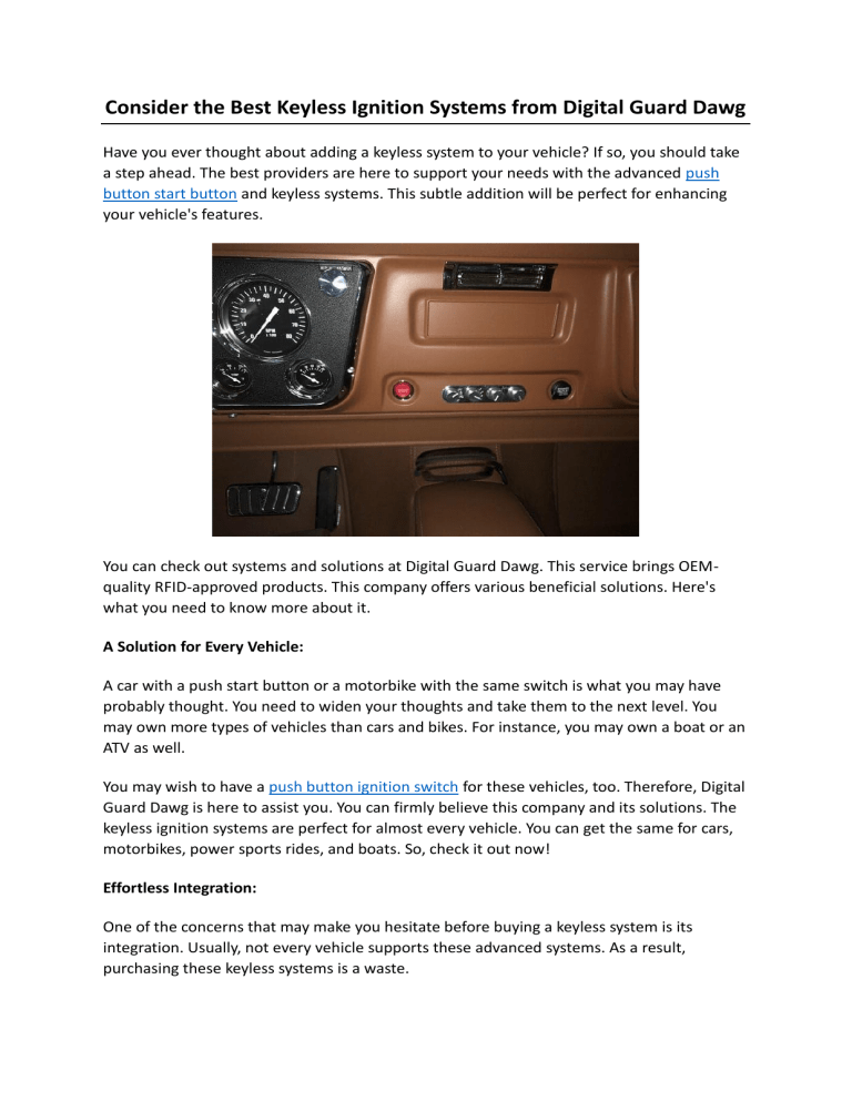 Consider the Best Keyless Ignition Systems from Digital Guard Dawg Have you ever thought about adding a keyless system to your vehicle? If so, you should take a step ahead. The best providers are here to support your needs with the advanced push button start button and keyless systems. This subtle addition will be perfect for enhancing your vehicle's features. You can check out systems and solutions at Digital Guard Dawg. This service brings OEMquality RFID-approved products. This company offers various beneficial solutions. Here's what you need to know more about it. A Solution for Every Vehicle: A car with a push start button or a motorbike with the same switch is what you may have probably thought. You need to widen your thoughts and take them to the next level. You may own more types of vehicles than cars and bikes. For instance, you may own a boat or an ATV as well. You may wish to have a push button ignition switch for these vehicles, too. Therefore, Digital Guard Dawg is here to assist you. You can firmly believe this company and its solutions. The keyless ignition systems are perfect for almost every vehicle. You can get the same for cars, motorbikes, power sports rides, and boats. So, check it out now! Effortless Integration: One of the concerns that may make you hesitate before buying a keyless system is its integration. Usually, not every vehicle supports these advanced systems. As a result, purchasing these keyless systems is a waste. Digital Guard Dawg assures you about your investments. You will never be disappointed with the systems you get. You can integrate them with your vehicle and add convenience to it. So, what are you waiting for? Check out the best solutions from this brand and pick the best one for your car, bike, etc. Other Advantages: You may be curious about the advantages offered by these systems. Firstly, it benefits the security. You can integrate alarms with these keyless integration systems for alerts and signals. The push start button will confuse intruders. Consequently, they won't be able to start the vehicle. Digital Guard Dawg has put intense thought into designs and development. The keyless systems from this brand definitely increase security. But for you, it will only add convenience. You can seamlessly unlock and start the vehicle, without any error. Hence, it adds comfort to your vehicle experience. So, check out this service and its solutions now. Find all the necessary details athttps://www.digitalguarddawg.com/ Original Source: https://bit.ly/4jdzYps
