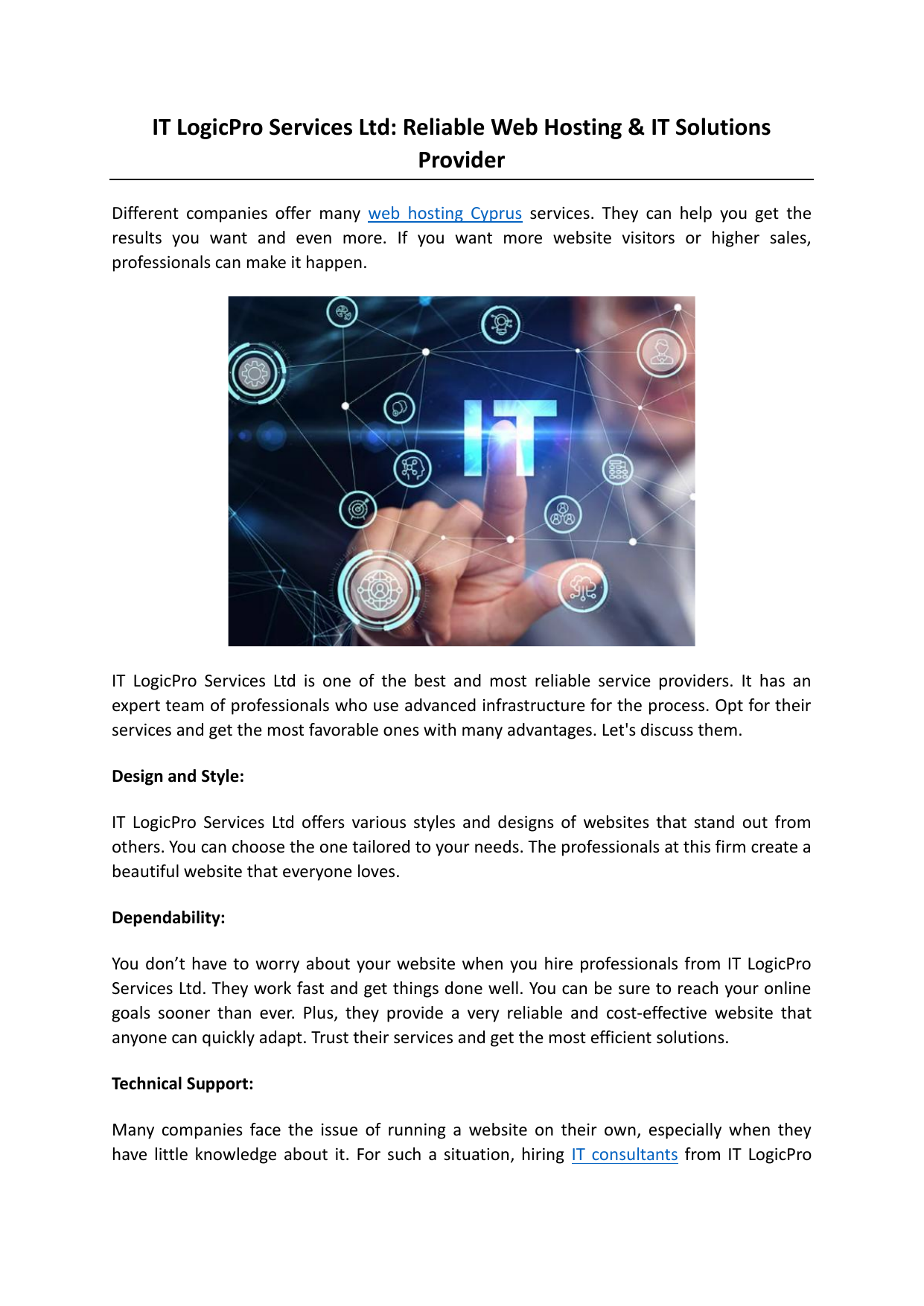 IT LogicPro Services Ltd: Reliable Web Hosting & IT Solutions Provider Different companies offer many web hosting Cyprus services. They can help you get the results you want and even more. If you want more website visitors or higher sales, professionals can make it happen. IT LogicPro Services Ltd is one of the best and most reliable service providers. It has an expert team of professionals who use advanced infrastructure for the process. Opt for their services and get the most favorable ones with many advantages. Let's discuss them. Design and Style: IT LogicPro Services Ltd offers various styles and designs of websites that stand out from others. You can choose the one tailored to your needs. The professionals at this firm create a beautiful website that everyone loves. Dependability: You don’t have to worry about your website when you hire professionals from IT LogicPro Services Ltd. They work fast and get things done well. You can be sure to reach your online goals sooner than ever. Plus, they provide a very reliable and cost-effective website that anyone can quickly adapt. Trust their services and get the most efficient solutions. Technical Support: Many companies face the issue of running a website on their own, especially when they have little knowledge about it. For such a situation, hiring IT consultants from IT LogicPro Services Ltd is good! It has skilled and trained designers who can solve the issue immediately and offer technical support whenever required. SEO Opportunities: Free web hosting services don't offer much help with SEO, which affects the ranking of your website on Google. But when you hire professionals from IT LogicPro Services Ltd, they use the best SEO strategies to boost your site’s visibility. It can optimize your search quality and give better results. Summary: In conclusion, IT LogicPro Services Ltd offers many advantages with its web hosting services. It provides other solutions like IT security, software management, onsite support providers, and custom software development. If you want any services, look nowhere other than IT LogicPro Services Ltd! It is one of the best and most efficient tech companies in Cyprus. Plus, it has professional technicians and consultants who are always there to help you. Pick their services and obtain the best possible solutions! For more information, you can check their official website by clicking https://itlogicpro.net/ Original Source: https://bit.ly/43TkCSh
