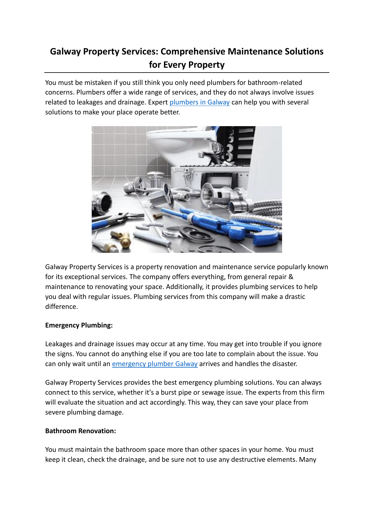 Galway Property Services: Comprehensive Maintenance Solutions for Every Property You must be mistaken if you still think you only need plumbers for bathroom-related concerns. Plumbers offer a wide range of services, and they do not always involve issues related to leakages and drainage. Expert plumbers in Galway can help you with several solutions to make your place operate better. Galway Property Services is a property renovation and maintenance service popularly known for its exceptional services. The company offers everything, from general repair & maintenance to renovating your space. Additionally, it provides plumbing services to help you deal with regular issues. Plumbing services from this company will make a drastic difference. Emergency Plumbing: Leakages and drainage issues may occur at any time. You may get into trouble if you ignore the signs. You cannot do anything else if you are too late to complain about the issue. You can only wait until an emergency plumber Galway arrives and handles the disaster. Galway Property Services provides the best emergency plumbing solutions. You can always connect to this service, whether it's a burst pipe or sewage issue. The experts from this firm will evaluate the situation and act accordingly. This way, they can save your place from severe plumbing damage. Bathroom Renovation: You must maintain the bathroom space more than other spaces in your home. You must keep it clean, check the drainage, and be sure not to use any destructive elements. Many times, people use harsh chemicals to clean bathroom tiles. It creates gaps in the surface, allowing water to seep through. Galway Property Services has worked on many projects where using such harsh chemicals on bathroom tiles resulted in absolute menace. The experts will retile the bathroom and make it functional again. The experts can also add aesthetical elements if you want to upgrade your bathroom's beauty through a renovation. Heating, Boilers, and Electric Showers: People install several systems to supply warm water through every faucet. Boilers and electric showers are the most suitable options in this condition. Additionally, people also install floor heating systems for comfort during cold seasons. Galway plumbing services helps these individuals with the required solutions. The plumbing experts from Galway Property Services provide insightful assistance to their clients. They suggest the best options to help your place become better. You can connect to this company and get the desired services. Check it out now! Get more details at https://galwaypropertyservices.ie/ Original Source: https://bit.ly/3EpmaZZ