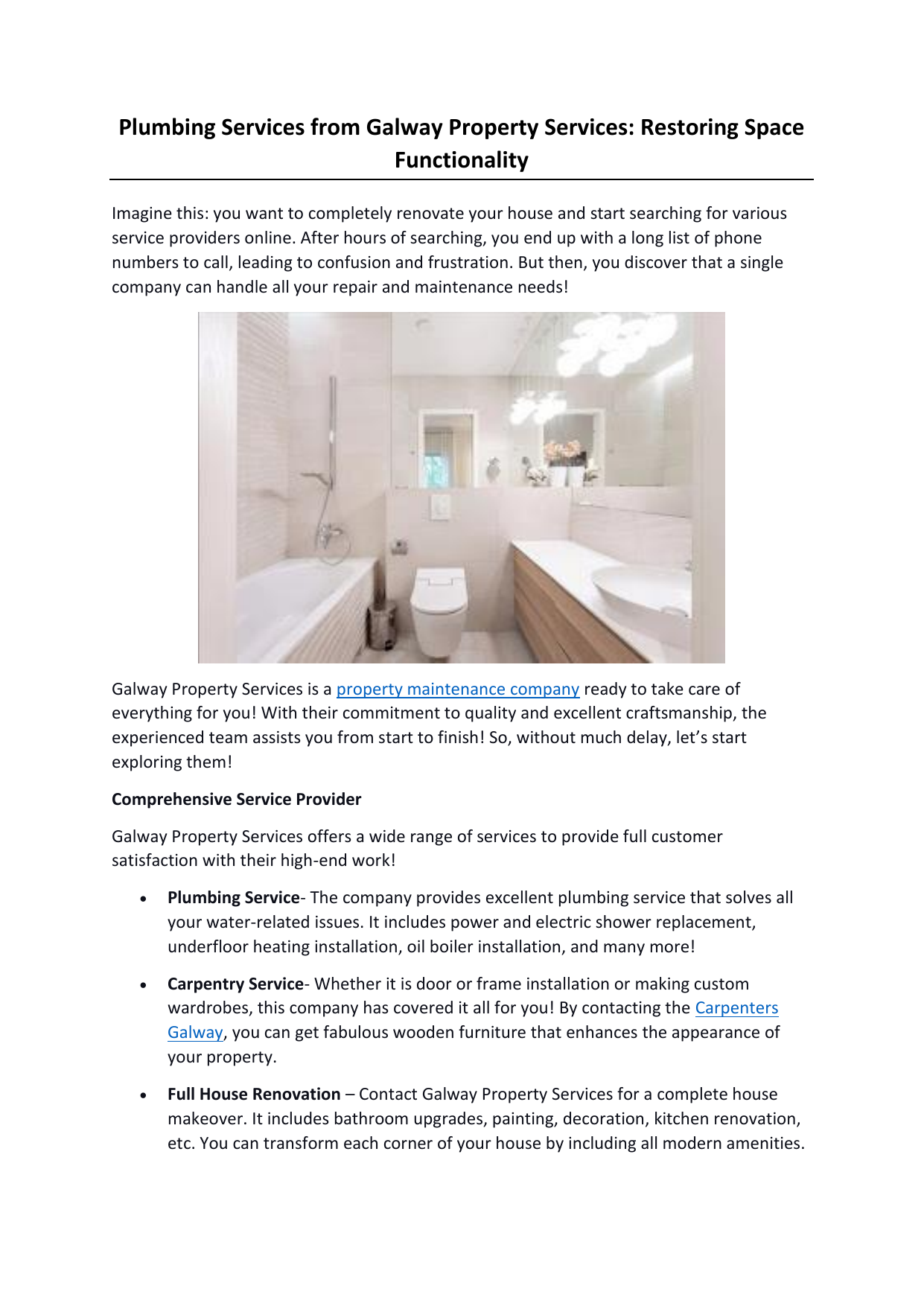 Plumbing Services from Galway Property Services: Restoring Space Functionality Imagine this: you want to completely renovate your house and start searching for various service providers online. After hours of searching, you end up with a long list of phone numbers to call, leading to confusion and frustration. But then, you discover that a single company can handle all your repair and maintenance needs! Galway Property Services is a property maintenance company ready to take care of everything for you! With their commitment to quality and excellent craftsmanship, the experienced team assists you from start to finish! So, without much delay, let’s start exploring them! Comprehensive Service Provider Galway Property Services offers a wide range of services to provide full customer satisfaction with their high-end work! • Plumbing Service- The company provides excellent plumbing service that solves all your water-related issues. It includes power and electric shower replacement, underfloor heating installation, oil boiler installation, and many more! • Carpentry Service- Whether it is door or frame installation or making custom wardrobes, this company has covered it all for you! By contacting the Carpenters Galway, you can get fabulous wooden furniture that enhances the appearance of your property. • Full House Renovation – Contact Galway Property Services for a complete house makeover. It includes bathroom upgrades, painting, decoration, kitchen renovation, etc. You can transform each corner of your house by including all modern amenities. • Tiling Service- The Galway Property Services offers a comprehensive range of tiling services. It includes waterproof bathroom tiling, kitchen tiling with durable flooring, and backsplashes. Additionally, the company provides wetroom, garden, and outdoor tiling. Why Choose Galway Property Services? • Customer Satisfaction Guaranteed- The company owns a team of experienced and committed members who provide quality services to the customers. The company prioritizes customer needs and delivers services to match their need and demands. • Quick Service – Galway Property Services performs their work rapidly and efficiently. The company believes in project completion with minimal disruption. Thus valuing customers' time and convenience. • Transparent Pricing – The company believes in making clear conversations regarding pricing matters. There are no hidden costs, just honest and upfront pricing that the company believes in. The experts from Galway Property Services provide insightful assistance to their clients. With their exceptional Galway carpentry services, they suggest the best options to help your place become better. You can connect to this company and get the desired services. Check it out now! Get more details at https://galwaypropertyservices.ie/ Original Source: https://bit.ly/432sdgk