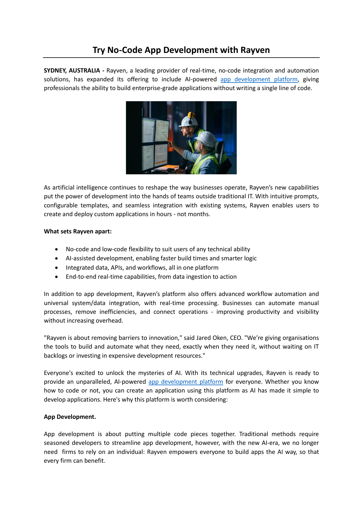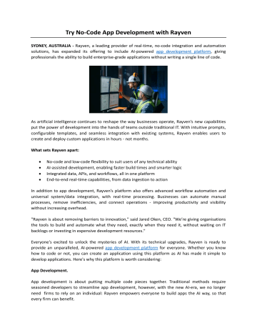 Try No-Code App Development with Rayven SYDNEY, AUSTRALIA - Rayven, a leading provider of real-time, no-code integration and automation solutions, has expanded its offering to include AI-powered app development platform, giving professionals the ability to build enterprise-grade applications without writing a single line of code. As artificial intelligence continues to reshape the way businesses operate, Rayven’s new capabilities put the power of development into the hands of teams outside traditional IT. With intuitive prompts, configurable templates, and seamless integration with existing systems, Rayven enables users to create and deploy custom applications in hours - not months. What sets Rayven apart: • • • • No-code and low-code flexibility to suit users of any technical ability AI-assisted development, enabling faster build times and smarter logic Integrated data, APIs, and workflows, all in one platform End-to-end real-time capabilities, from data ingestion to action In addition to app development, Rayven’s platform also offers advanced workflow automation and universal system/data integration, with real-time processing. Businesses can automate manual processes, remove inefficiencies, and connect operations - improving productivity and visibility without increasing overhead. "Rayven is about removing barriers to innovation," said Jared Oken, CEO. "We’re giving organisations the tools to build and automate what they need, exactly when they need it, without waiting on IT backlogs or investing in expensive development resources." Everyone's excited to unlock the mysteries of AI. With its technical upgrades, Rayven is ready to provide an unparalleled, AI-powered app development platform for everyone. Whether you know how to code or not, you can create an application using this platform as AI has made it simple to develop applications. Here's why this platform is worth considering: App Development. App development is about putting multiple code pieces together. Traditional methods require seasoned developers to streamline app development, however, with the new AI-era, we no longer need firms to rely on an individual: Rayven empowers everyone to build apps the AI way, so that every firm can benefit. Rayven allows you to develop low-code apps end-to-end. You can configure SMB or enterprise app development using AI templates and prompts. It may or may not involve coding based on your application requirements and skills. Rayven allows you to integrate data, APIs, and systems, making this easy-to-configure and integrated solution a ground breaker for app development. Workflow Automation: A couple of decades ago, organisational procedures took time. Professionals had to deal with repetitive tasks at a higher level, affecting their productivity. With software automation, everything seemed more streamlined, but now organisations can try AI-based platforms to automate workflows and speed-up again. The Rayven AI application development platform allows you to use its advanced features to add automation to any business operation or process. Businesses can remove redundant procedures and automate primary and intermediary tasks using this AI platform. The Bottom-Line: Software solutions have ruled the business world for several decade, but no-one knew if any level of innovation could make app development something that anyone could do. However, recent AI development have been a game-changer, with platforms like Rayven building it into our product and reducing business’ reliance on coders and developers. People and organisations can conveniently create bespoke applications and integrate them with their existing systems and procedures using an automation platform, simply. About Rayven Rayven is a real-time, no- and low-code platform that makes it easy to build intelligent workflow automations and integrated applications using AI, fast. Designed for technical and non-technical users, Rayven enables organisations to streamline operations, connect systems, and make smarter decisions using live data. Whether optimising processes or launching digital services, Rayven helps businesses of any size or scale to work better, simply. Learn more at www.rayven.io Original Source: https://bit.ly/3Z1hnVu