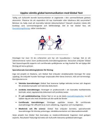 Upplev sömlös global kommunikation med Global Text Tydlig och kulturellt korrekt kommunikation är avgörande i den sammanlänkade globala ekonomin. Planerar du att expandera till nya marknader eller lokalisera ditt varumärke? Behöver du hjälp med att översätta teknisk dokumentation? Oavsett situation måste ditt budskap vara sammanhängande och lättförståeligt. Det är här Global Text, ett översättningsföretag, sätter standarden. Företaget har över 15 års erfarenhet och har sitt huvudkontor i Sverige. Det är ett välrenommerat namn inom professionella översättningstjänster. Dessutom erbjuder Global Text branschspecifik expertis och certifierade språktjänster av hög kvalitet för att hjälpa ditt företag att korsa gränser. Specialiserade översättningstjänster för företag Inga två projekt är likadana, och Global Text erbjuder skräddarsydda lösningar för varje uppdrag. De erbjuder kunder lösningar anpassade efter deras bransch, mål och terminologi. Kärntjänsterna är: • Tekniska översättningar: Global Text levererar tydliga tekniska termer och diagram för användarmanualer och tekniska dokument. • Juridiska översättningar: Företaget är professionellt i att översätta konfidentiella kontrakt, avtal, regulatoriska dokument och juridiska texter. • IT- och webblokalisering: Global Text är en av de bästa översättningsbyråer na och hjälper dig att tala med användare på alla språk de förstår. • Certifierade översättningar: Företaget uppfyller kraven för certifierade översättningar för officiellt bruk inom utbildning, migration och myndigheter. • Medicinsk och life science: Global Text erbjuder korrekta, specialiserade översättningar för kliniska prövningar, vårddokumentation och läkemedelsinnehåll. Varje projekt hos Global Text övervakas av modersmålstalande lingvister med gedigen expertis. Resultatet? Naturligt korrekta och kulturellt relevanta språköversättningar. Pålitliga tidsramar och konsekventa resultat Att hålla deadlines är lika viktigt som att upprätthålla kvalitet. Effektivitet är en självklar del av arbetet på Global Text. De erfarna projektledarna övervakar översättningsprocesserna och säkerställer konsekvens, punktlighet och noggrannhet. Dessutom använder teamet översättningsminnesverktyg för att snabba upp återkommande innehåll och effektivisera större uppdrag. Detta ökar leveranstakten och stärker varumärkets röst över olika marknader. En översättningspartner som förstår ditt företag Översättning handlar om mer än ord. Det innefattar sammanhang, tonläge och branschkunskap. Global Text har bakgrunden för att förstå din terminologi inom finans, juridik, vård, teknik och tillverkning – och leverera rätt resultat. Dessutom förstår teamet vikten av sekretess och efterlevnad vid hantering av känslig affärsinformation. De inkluderar diskretion, datasäkerhet och professionell etik i varje uppdrag de åtar sig. Pålitliga för yrkesverksamma över hela världen Under årens lopp har Global Text hjälpt många företag att expandera och förfina sin kommunikation. Kunderna vittnar ofta om förbättrad affärsverksamhet och kommunikation med internationella kunder, investerare och samarbetspartners. Flera kunder har också delat att anlitandet av Global Text, den bästa översättningsbyrå Stockholm , hjälpte dem att effektivt nå ut till målgrupper utomlands. För mer information, besök https://globaltext.se/ Original Source: https://bit.ly/4iPAby6