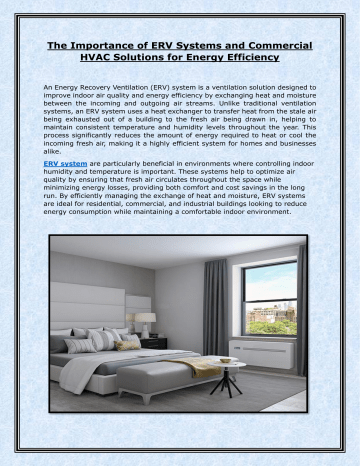 The Importance of ERV Systems and Commercial HVAC Solutions for Energy Efficiency An Energy Recovery Ventilation (ERV) system is a ventilation solution designed to improve indoor air quality and energy efficiency by exchanging heat and moisture between the incoming and outgoing air streams. Unlike traditional ventilation systems, an ERV system uses a heat exchanger to transfer heat from the stale air being exhausted out of a building to the fresh air being drawn in, helping to maintain consistent temperature and humidity levels throughout the year. This process significantly reduces the amount of energy required to heat or cool the incoming fresh air, making it a highly efficient system for homes and businesses alike. ERV system are particularly beneficial in environments where controlling indoor humidity and temperature is important. These systems help to optimize air quality by ensuring that fresh air circulates throughout the space while minimizing energy losses, providing both comfort and cost savings in the long run. By efficiently managing the exchange of heat and moisture, ERV systems are ideal for residential, commercial, and industrial buildings looking to reduce energy consumption while maintaining a comfortable indoor environment. Why an ERV System is Essential for Energy Efficiency One of the primary reasons for installing an ERV system is the significant impact it has on energy efficiency. Traditional ventilation systems often pull in air that must be conditioned—heated in the winter or cooled in the summer—before it enters the building. However, this process consumes a considerable amount of energy. An ERV system, by transferring heat and moisture, reduces the need for additional heating or cooling, which leads to a reduction in energy consumption. The benefits of an ERV system go beyond just energy savings. By continuously providing fresh, filtered air, ERVs help maintain indoor air quality by removing excess moisture and pollutants from the air. This is particularly important in commercial and residential spaces where air quality can deteriorate over time due to insufficient ventilation. An ERV system helps prevent issues such as mold, allergens, and stale air, contributing to a healthier, more comfortable environment. What is Commercial HVAC? Commercial HVAC refers to the heating, ventilation, and air conditioning systems used in commercial buildings such as offices, restaurants, hospitals, and schools. These systems are designed to handle the unique needs of larger spaces, providing climate control, air filtration, and humidity regulation for a diverse range of environments. Commercial HVAC systems are typically more robust and complex than residential systems, as they must be able to efficiently heat and cool larger areas while maintaining air quality and comfort for a greater number of people. A well-designed commercial HVAC system is critical to maintaining employee productivity, customer comfort, and the overall health of a building’s occupants. These systems include components such as air handlers, chillers, boilers, ducts, and thermostats, all working together to ensure that the building remains at a consistent temperature and humidity level. Commercial HVAC systems can be customized to meet the specific needs of the building, whether that’s focusing on energy efficiency, air quality, or temperature control. How ERV Systems Integrate with Commercial HVAC Systems When combined with a commercial HVAC system, an ERV system offers even greater energy savings and improved air quality. In commercial spaces, energy consumption can quickly add up, especially if the building is large or operates during extended hours. Integrating an ERV system with an HVAC setup allows the building to precondition the incoming air, reducing the strain on the HVAC system and optimizing energy use. For example, in the summer, an ERV system will pre-cool the incoming air using the cool air being exhausted from the building, minimizing the amount of work the air conditioning system has to do. In the winter, it works the same way by preheating the incoming cold air, thus reducing the workload on the heating system. This synergy between the ERV and commercial HVAC system can significantly reduce energy costs, making it a crucial part of modern, energy-efficient building designs. The Benefits of Combining ERV and Commercial HVAC Systems The integration of an ERV system with commercial HVAC provides numerous benefits beyond just energy savings. These systems work together to improve indoor air quality by ensuring that fresh air is consistently circulated, helping to prevent indoor air pollution, reduce humidity levels, and eliminate stale air. With better ventilation and air circulation, employees, customers, and other building occupants can experience improved comfort and productivity. Moreover, by utilizing an ERV system, businesses can comply with increasingly strict energy efficiency regulations. Many building codes now require systems that meet certain sustainability and efficiency standards. An ERV system combined with an efficient HVAC solution helps meet these standards while also reducing the carbon footprint of the building, making it an environmentally responsible choice. Why Choose an ERV System for Your Commercial Space? An ERV system is an excellent choice for any business looking to improve air quality and reduce energy costs. The system offers a cost-effective way to manage ventilation in a building without sacrificing comfort or air quality. Whether you’re running a large office building, a restaurant, or a school, an ERV system can help you maintain a pleasant and healthy environment for your staff and customers. When combined with a commercial HVAC system, the ERV system enhances energy efficiency and ensures that your HVAC system runs at its optimal performance level. The result is reduced operational costs, better environmental performance, and increased occupant com