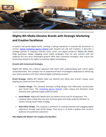 Mighty 8th Media Elevates Brands with Strategic Marketing and Creative Excellence In today’s fast-paced digital world, creating a lasting impression is essential for businesses to survive. Digital marketing agency Atlanta goes beyond just ads and analytics; it becomes a strategic partner in shaping a brand’s voice, vision, and digital presence! Mighty 8th Media helps businesses design engaging social media campaigns that not only connect with the audience but also drive meaningful growth! With their innovative strategies, they ensure the brand stays ahead in this highly competitive digital marketplace. Growth with Customized Strategies Mighty 8th Media has a distinct approach that starts with understanding each client’s goals comprehensively. The company has an experienced team of strategists dedicated to enhancing your online presence with their tailored digital marketing services! Brand Strategy: Mighty 8th Media helps you identify and refine your brand’s unique voice helping you stand out from the crowd. Creative Design: The company develops striking designs that effectively communicate your brand story. This marketing agency Atlanta, crafts unique and attractive visual elements that captivate target audience easily. Social Media: Mighty 8th Media does not believe inone sizes fit all approach. The company takes a deep dive into your business goals and study audience behavior to create a strong social media strategy. Web UX/UI Design: The company is proficient in creating seamless and engaging digital experience through web UI/UX design. Their focus is to build a website that converts audience into potential customers! Why Mighty 8th Media? Let’s Explore the Benefits! Are you looking for a partner who truly gets your brand? That can help you in standing out in this crowded digital marketplace? Here’s why Mighty 8th Media could be the perfect fit for you: Creative Strategies: The company believes in setting the trend that others follow! Mighty 8th Media team works to create innovative, tailored strategies that make your brand shine! Passion and Expertise: Mighty 8th Media’s project is driven by a passionate team with years of experience in the digital marketplace. The team lives and breathes creativity, and brings energy to each project! Ready to Elevate Your Brand? Mighty 8th Media doesn’t just provide a service, it crafts a lasting partnership that elevates your business. Recognized as one of the Atlanta’s largest advertising and marketing agencies, it stands out as the leading branding agency Atlanta GA. Known for creating personalized designs to amplify your brand’s voice and ensure lasting impact in the market! Ready to take your brand to the next level? For more information, visit https://www.m8th.com/ Original Source: https://bit.ly/4k2cXWT