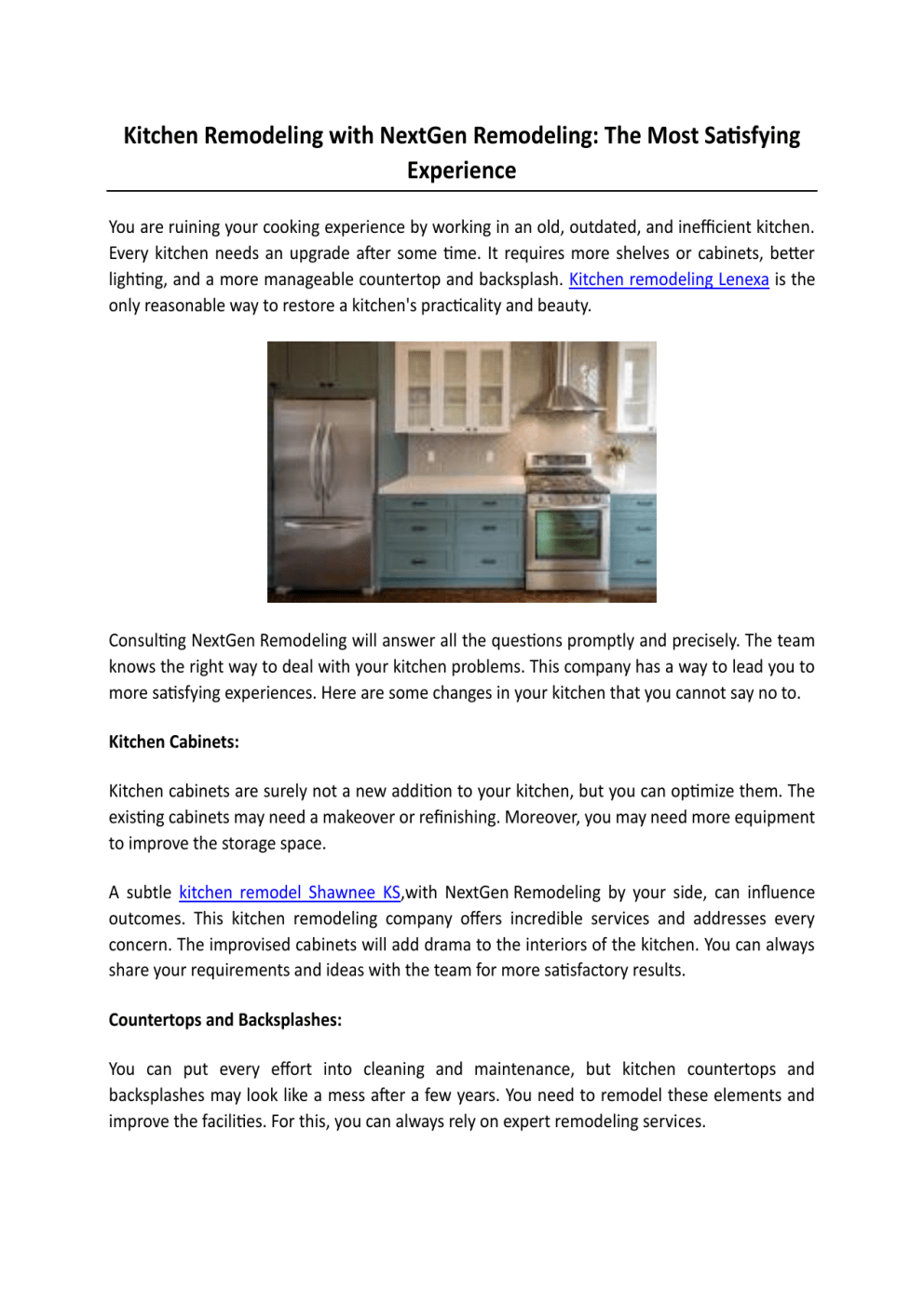 Kitchen Remodeling with NextGen Remodeling: The Most Satisfying Experience You are ruining your cooking experience by working in an old, outdated, and inefficient kitchen. Every kitchen needs an upgrade after some time. It requires more shelves or cabinets, better lighting, and a more manageable countertop and backsplash. Kitchen remodeling Lenexa is the only reasonable way to restore a kitchen's practicality and beauty. Consulting NextGen Remodeling will answer all the questions promptly and precisely. The team knows the right way to deal with your kitchen problems. This company has a way to lead you to more satisfying experiences. Here are some changes in your kitchen that you cannot say no to. Kitchen Cabinets: Kitchen cabinets are surely not a new addition to your kitchen, but you can optimize them. The existing cabinets may need a makeover or refinishing. Moreover, you may need more equipment to improve the storage space. A subtle kitchen remodel Shawnee KS,with NextGen Remodeling by your side, can influence outcomes. This kitchen remodeling company offers incredible services and addresses every concern. The improvised cabinets will add drama to the interiors of the kitchen. You can always share your requirements and ideas with the team for more satisfactory results. Countertops and Backsplashes: You can put every effort into cleaning and maintenance, but kitchen countertops and backsplashes may look like a mess after a few years. You need to remodel these elements and improve the facilities. For this, you can always rely on expert remodeling services. NextGen Remodeling is undoubtedly the best option for you. The company offers impeccable kitchen remodeling services. It can help you with a whole makeover or elemental changes based on your requirements. Adding a beautiful and luxurious countertop will redefine the beauty of the kitchen. Moreover, an elegant backsplash will be an extraordinary addition to the kitchen. Under-Cabinet Kitchen Lighting: The single overhead lighting fixture in the kitchen might have served you long enough. But it may have affected your vision gradually. You need suitable lighting on the kitchen countertop for enhanced visibility. The most concerning part is the cabinets that block the light. NextGen Remodeling can help you deal with this issue through a small kitchen remodel Overland Park. Installing under-cabinet kitchen lighting is a way to overcome the issue. You can get focused lights on the countertop. This way, poor lighting won't obstruct or blur your vision. Connect to this service now and get these elements in your kitchen. Check out more at https://nextgenkc.com/ Original Source: https://bit.ly/3GJ1k8C