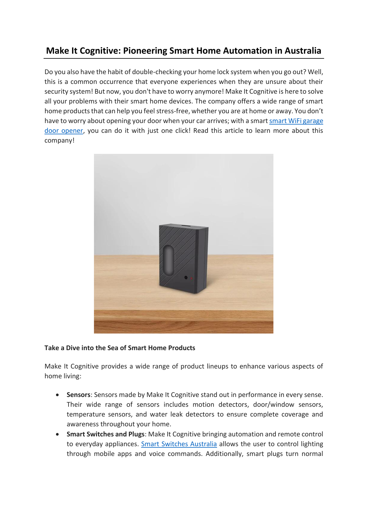 Make It Cognitive: Pioneering Smart Home Automation in Australia Do you also have the habit of double-checking your home lock system when you go out? Well, this is a common occurrence that everyone experiences when they are unsure about their security system! But now, you don't have to worry anymore! Make It Cognitive is here to solve all your problems with their smart home devices. The company offers a wide range of smart home products that can help you feel stress-free, whether you are at home or away. You don’t have to worry about opening your door when your car arrives; with a smart smart WiFi garage door opener, you can do it with just one click! Read this article to learn more about this company! Take a Dive into the Sea of Smart Home Products Make It Cognitive provides a wide range of product lineups to enhance various aspects of home living: • • Sensors: Sensors made by Make It Cognitive stand out in performance in every sense. Their wide range of sensors includes motion detectors, door/window sensors, temperature sensors, and water leak detectors to ensure complete coverage and awareness throughout your home. Smart Switches and Plugs: Make It Cognitive bringing automation and remote control to everyday appliances. Smart Switches Australia allows the user to control lighting through mobile apps and voice commands. Additionally, smart plugs turn normal • • electrical appliances into smart devices that can monitor and control energy consumption. Smart Controllers and Hubs: The smart controllers are called the brain of the smart home! These automation hubs by the company, help in maintaining coordination between sensors and devices. For instance, turning off all lights and locking doors when leaving home. Smart Home Kits: Make It Cognitive offers a comprehensive range of DIY home kits for customers who want a complete package of products. The company has three types of kits, namely, starter kits (for beginners including basic sensors and switches) security kits (for surveillance and protection), and energy-saving kits (to cut down electricity bills). Why Choose Make It Cognitive? • • Easy to install: Make It Cognitive offers smart home devices and products that are easy to use and install. You can refer to their simple instructions booklet to plug and play devices! Reliable Quality: The Company ensures top-quality smart devices for their customers, by carefully selecting products that meet safety and performance standards. Ready to explore the world of smart home devices? Whether you want a Wifi garage door opener or sensor for your home, you can completely rely on Make It Cognitive for all your smart needs! Smart living is just a call away! For more details, visit https://www.makeitcognitive.com.au/ Original Source: https://bit.ly/44u5gUv