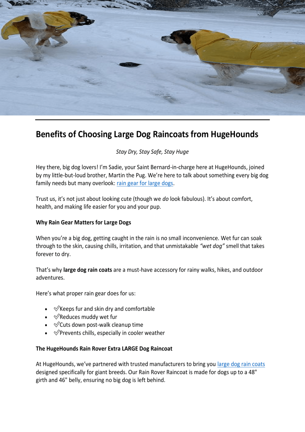 Benefits of Choosing Large Dog Raincoats from HugeHounds Stay Dry, Stay Safe, Stay Huge Hey there, big dog lovers! I’m Sadie, your Saint Bernard-in-charge here at HugeHounds, joined by my little-but-loud brother, Martin the Pug. We’re here to talk about something every big dog family needs but many overlook: rain gear for large dogs. Trust us, it’s not just about looking cute (though we do look fabulous). It’s about comfort, health, and making life easier for you and your pup. Why Rain Gear Matters for Large Dogs When you’re a big dog, getting caught in the rain is no small inconvenience. Wet fur can soak through to the skin, causing chills, irritation, and that unmistakable “wet dog” smell that takes forever to dry. That’s why large dog rain coats are a must-have accessory for rainy walks, hikes, and outdoor adventures. Here’s what proper rain gear does for us: ✅Keeps fur and skin dry and comfortable ✅Reduces muddy wet fur ✅Cuts down post-walk cleanup time ✅Prevents chills, especially in cooler weather The HugeHounds Rain Rover Extra LARGE Dog Raincoat At HugeHounds, we’ve partnered with trusted manufacturers to bring you large dog rain coats designed specifically for giant breeds. Our Rain Rover Raincoat is made for dogs up to a 48" girth and 46" belly, ensuring no big dog is left behind. Why you’ll love it: Waterproof, durable material that handles even the messiest weather Adjustable half-hood to protect ears without blocking vision Roomy fit so it layers comfortably over a heavy duty dog harness Generous harness access opening so you can clip your leash with ease Travel-friendly with a lightweight, packable carrying bag This isn’t just a “cute accessory”—it’s functional, protective gear built for the real-life needs of large breeds. Pair It with a Heavy Duty Dog Harness for Maximum Control Rainy walks come with extra challenges: slippery sidewalks, excited pups, and unpredictable footing. That’s why we recommend pairing your large dog rain coat with a heavy duty dog harness like the HugeHounds Big Dog Walking Harness. Together, they create the ultimate rainy-day combo: Stay dry with full-body rain protection Stay safe with secure, no-pull, no-choke harness control Stay visible with reflective detailing and bright raincoat colors Final Thoughts from Sadie & Martin Rainy weather doesn’t have to mean skipped walks or soggy disasters. With the right rain gear for large dogs, you can turn drizzly days into fun, mess-free adventures. At HugeHounds, we’re here to help big dogs (and their humans) enjoy the outdoors in any weather—with thoughtfully designed gear that fits, functions, and lasts. So, grab your coat, clip your harness, and let’s splash into adventure—together. – Sadie & Martin To get more information, visit: https://hugehounds.com/ Original Source: https://bit.ly/3SrjQon