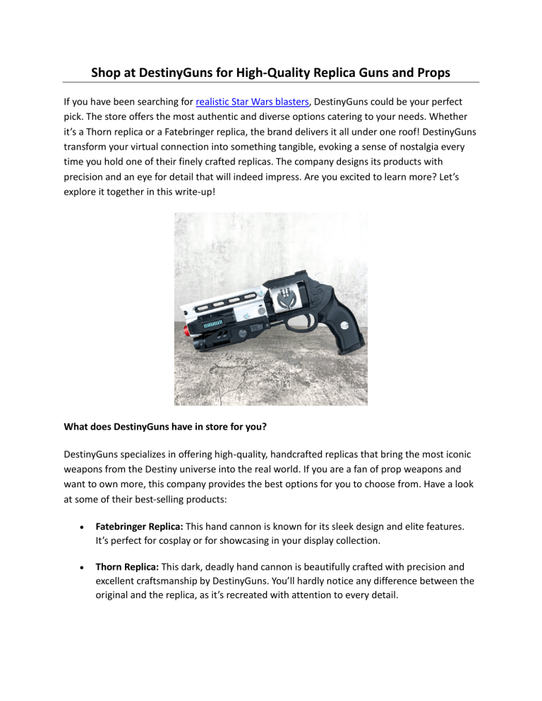 Shop at DestinyGuns for High-Quality Replica Guns and Props If you have been searching for realistic Star Wars blasters, DestinyGuns could be your perfect pick. The store offers the most authentic and diverse options catering to your needs. Whether it’s a Thorn replica or a Fatebringer replica, the brand delivers it all under one roof! DestinyGuns transform your virtual connection into something tangible, evoking a sense of nostalgia every time you hold one of their finely crafted replicas. The company designs its products with precision and an eye for detail that will indeed impress. Are you excited to learn more? Let’s explore it together in this write-up! What does DestinyGuns have in store for you? DestinyGuns specializes in offering high-quality, handcrafted replicas that bring the most iconic weapons from the Destiny universe into the real world. If you are a fan of prop weapons and want to own more, this company provides the best options for you to choose from. Have a look at some of their best-selling products: • Fatebringer Replica: This hand cannon is known for its sleek design and elite features. It’s perfect for cosplay or for showcasing in your display collection. • Thorn Replica: This dark, deadly hand cannon is beautifully crafted with precision and excellent craftsmanship by DestinyGuns. You’ll hardly notice any difference between the original and the replica, as it’s recreated with attention to every detail. • Destiny 2 Gun: The Destiny 2 gun is an exotic hand cannon like the Ace of Spades rifle known for its spectacular detailing and powerful capabilities. At DestinyGuns, you can get the best Destiny 2 gun replicas with the finest handcrafted designs and features. Why to Choose DestinyGuns? • Excellent Craftsmanship: Every DestinyGuns product is handcrafted with precision and dedication, ensuring top-notch quality. Their team of trained professionals is passionate about both gaming and prop making, guaranteeing a premium product every time. • Exact Replicas: The company is proficient in crafting the exact replicas of hand cannons to provide you with the most realistic look possible. • Global Reach: DestinyGuns products have fans from around the world, making it a go-to brand around the globe. If you want to buy a Thorn hand cannon replica, check out the collection at DestinyGuns. You will surely find something that matches your needs in its versatile collection. What are you waiting for? Grab the most amazing, handcrafted replicas at DestinyGuns now. For more details, visit https://destinyguns.com/ Original Source: https://bit.ly/4j3CXjm