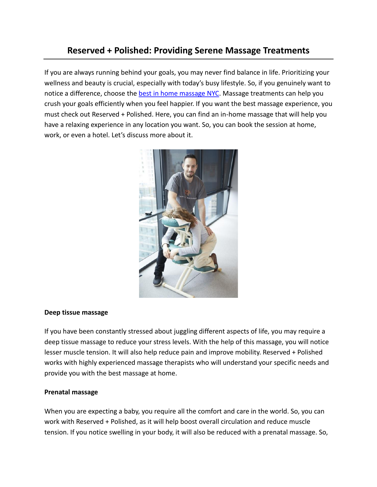 Reserved + Polished: Providing Serene Massage Treatments If you are always running behind your goals, you may never find balance in life. Prioritizing your wellness and beauty is crucial, especially with today’s busy lifestyle. So, if you genuinely want to notice a difference, choose the best in home massage NYC. Massage treatments can help you crush your goals efficiently when you feel happier. If you want the best massage experience, you must check out Reserved + Polished. Here, you can find an in-home massage that will help you have a relaxing experience in any location you want. So, you can book the session at home, work, or even a hotel. Let’s discuss more about it. Deep tissue massage If you have been constantly stressed about juggling different aspects of life, you may require a deep tissue massage to reduce your stress levels. With the help of this massage, you will notice lesser muscle tension. It will also help reduce pain and improve mobility. Reserved + Polished works with highly experienced massage therapists who will understand your specific needs and provide you with the best massage at home. Prenatal massage When you are expecting a baby, you require all the comfort and care in the world. So, you can work with Reserved + Polished, as it will help boost overall circulation and reduce muscle tension. If you notice swelling in your body, it will also be reduced with a prenatal massage. So, if you want a calming experience without stepping out of your home, you can choose a prenatal massage session. Sports massage Various sports enthusiasts may struggle with muscle soreness. But if you truly want to perform excellently every time you play a sport or exercise, you must choose a sports massage from Reserved + Polished. It can help reduce the soreness and promote healing. So, if you notice it after your gym session or a long marathon, sports massage will be a game changer for you. Chair massage If you do not have the time for a long, detailed massage, you can choose chair massage NJ, as it can significantly help you feel relaxed. The therapist from Reserved + Polished will provide these chair massages at your home. These chair massages are also suitable for different corporate events. Hence, you can choose them for any location. A chair massage in the office can help you recharge before a hectic day. If you are looking for an in home massage NYC, you must choose Reserved + Polished. Here, you will get the most outstanding experience. To get more details, visit https://reservedpolished.com/ Original Source: https://bit.ly/4dsvwkv