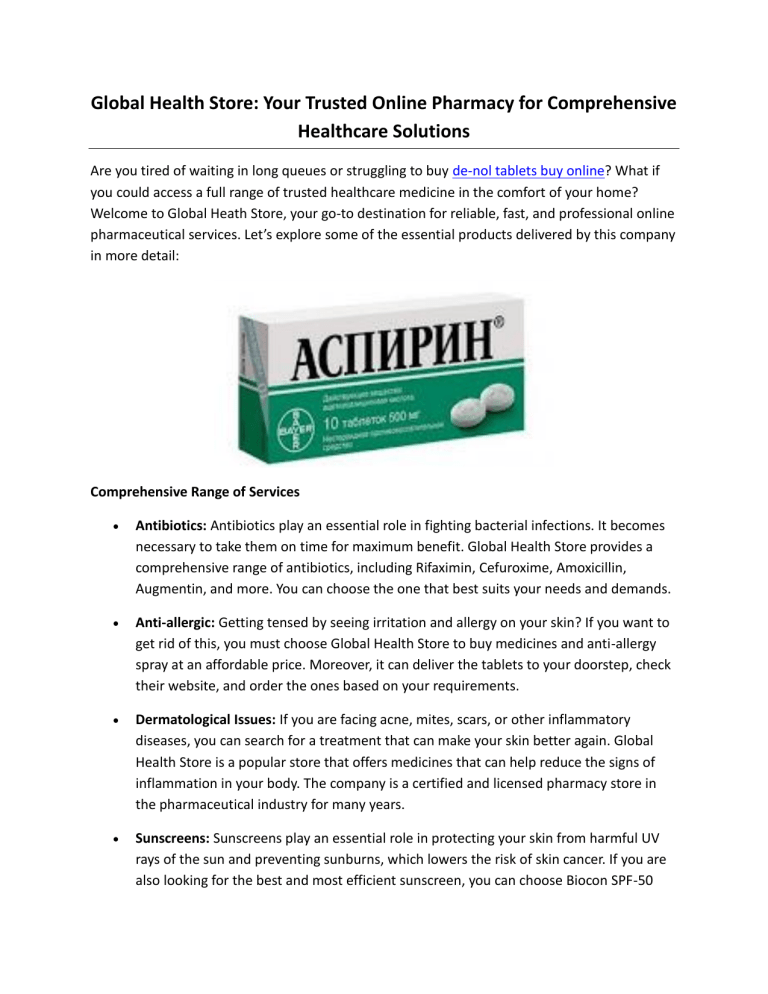 Global Health Store: Your Trusted Online Pharmacy for Comprehensive Healthcare Solutions Are you tired of waiting in long queues or struggling to buy de-nol tablets buy online? What if you could access a full range of trusted healthcare medicine in the comfort of your home? Welcome to Global Heath Store, your go-to destination for reliable, fast, and professional online pharmaceutical services. Let’s explore some of the essential products delivered by this company in more detail: Comprehensive Range of Services • Antibiotics: Antibiotics play an essential role in fighting bacterial infections. It becomes necessary to take them on time for maximum benefit. Global Health Store provides a comprehensive range of antibiotics, including Rifaximin, Cefuroxime, Amoxicillin, Augmentin, and more. You can choose the one that best suits your needs and demands. • Anti-allergic: Getting tensed by seeing irritation and allergy on your skin? If you want to get rid of this, you must choose Global Health Store to buy medicines and anti-allergy spray at an affordable price. Moreover, it can deliver the tablets to your doorstep, check their website, and order the ones based on your requirements. • Dermatological Issues: If you are facing acne, mites, scars, or other inflammatory diseases, you can search for a treatment that can make your skin better again. Global Health Store is a popular store that offers medicines that can help reduce the signs of inflammation in your body. The company is a certified and licensed pharmacy store in the pharmaceutical industry for many years. • Sunscreens: Sunscreens play an essential role in protecting your skin from harmful UV rays of the sun and preventing sunburns, which lowers the risk of skin cancer. If you are also looking for the best and most efficient sunscreen, you can choose Biocon SPF-50 sunscreen from Global Health Store, a cream specially designed to protect your skin from sun rays. • Noliprel: Suffering from high bold pressure? You can take noliprel in USA to reduce the risk of cardiovascular diseases, as high hypertension can increase the risk of such diseases. • Supplements: Global Health Store is also known to deliver top-quality vitamins and supplements, which are good for physical and mental health. Also, they are used to cure various skin, heart, and bone diseases. Looking for a reliable medicine store to buy noliprel forte in USA? Well, your search ends here at Global Health Store. You can also buy other medicines such as Rifaximin, Cefuroxime, Amoxicillin, and many more by visiting their online store! For more details, visit https://globalhealthe.com/ Original Source: https://bit.ly/3GZSTWr