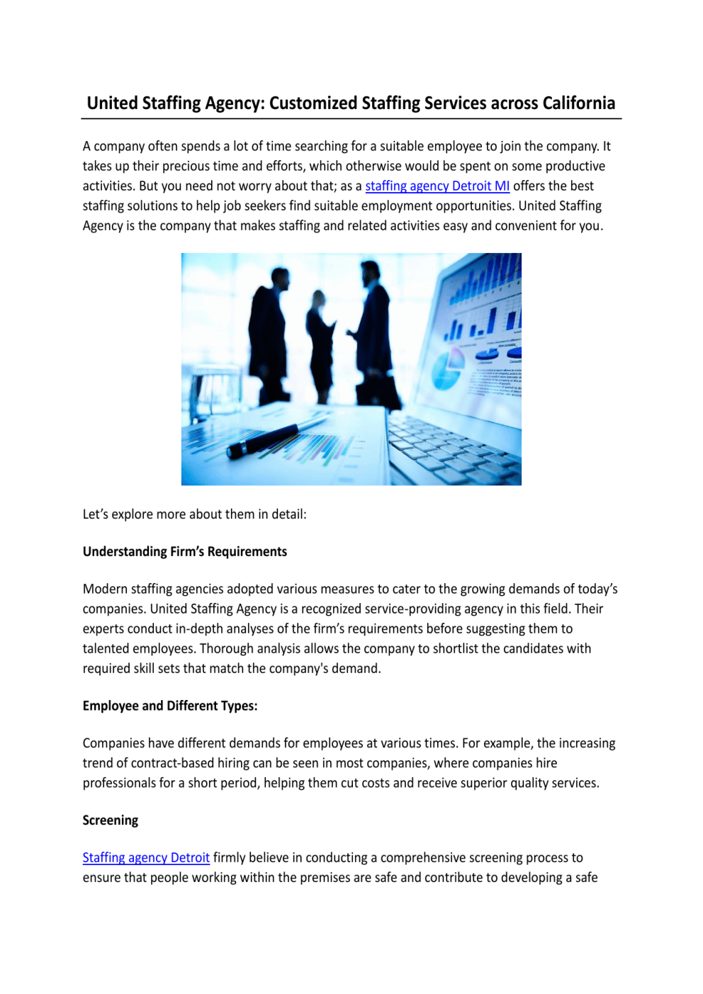 United Staffing Agency: Customized Staffing Services across California A company often spends a lot of time searching for a suitable employee to join the company. It takes up their precious time and efforts, which otherwise would be spent on some productive activities. But you need not worry about that; as a staffing agency Detroit MI offers the best staffing solutions to help job seekers find suitable employment opportunities. United Staffing Agency is the company that makes staffing and related activities easy and convenient for you. Let’s explore more about them in detail: Understanding Firm’s Requirements Modern staffing agencies adopted various measures to cater to the growing demands of today’s companies. United Staffing Agency is a recognized service-providing agency in this field. Their experts conduct in-depth analyses of the firm’s requirements before suggesting them to talented employees. Thorough analysis allows the company to shortlist the candidates with required skill sets that match the company's demand. Employee and Different Types: Companies have different demands for employees at various times. For example, the increasing trend of contract-based hiring can be seen in most companies, where companies hire professionals for a short period, helping them cut costs and receive superior quality services. Screening Staffing agency Detroit firmly believe in conducting a comprehensive screening process to ensure that people working within the premises are safe and contribute to developing a safe working culture. United Staffing Agency can aid you in accomplishing this function in a smooth and manageable way. Cost Effective Solutions United Staffing Agency understands that various organizations have their specific budget that can cater to staffing and related services. So, it becomes easy to recruit employees conveniently. Boost Productivity The staff at United Staffing Agency work towards achieving your business success. They have specialized strategies and tactics that can ensure finding the employees who can aid you in seamlessly handling your work. Offers Flexibility United Staffing Agency offers flexible solutions that can handle workload easily and at your own pace. The employees understand your needs and demands and contribute to achieving your business goals smoothly and effectively. If you want to work with temp agencies in Warren MI, contact United Staffing Agency as soon as possible. The company works hand in hand to provide solutions for your recruitment and selection needs. To get more details, visit https://unitedstaffinggroup.com/ Original Source: https://bit.ly/43g9VbK