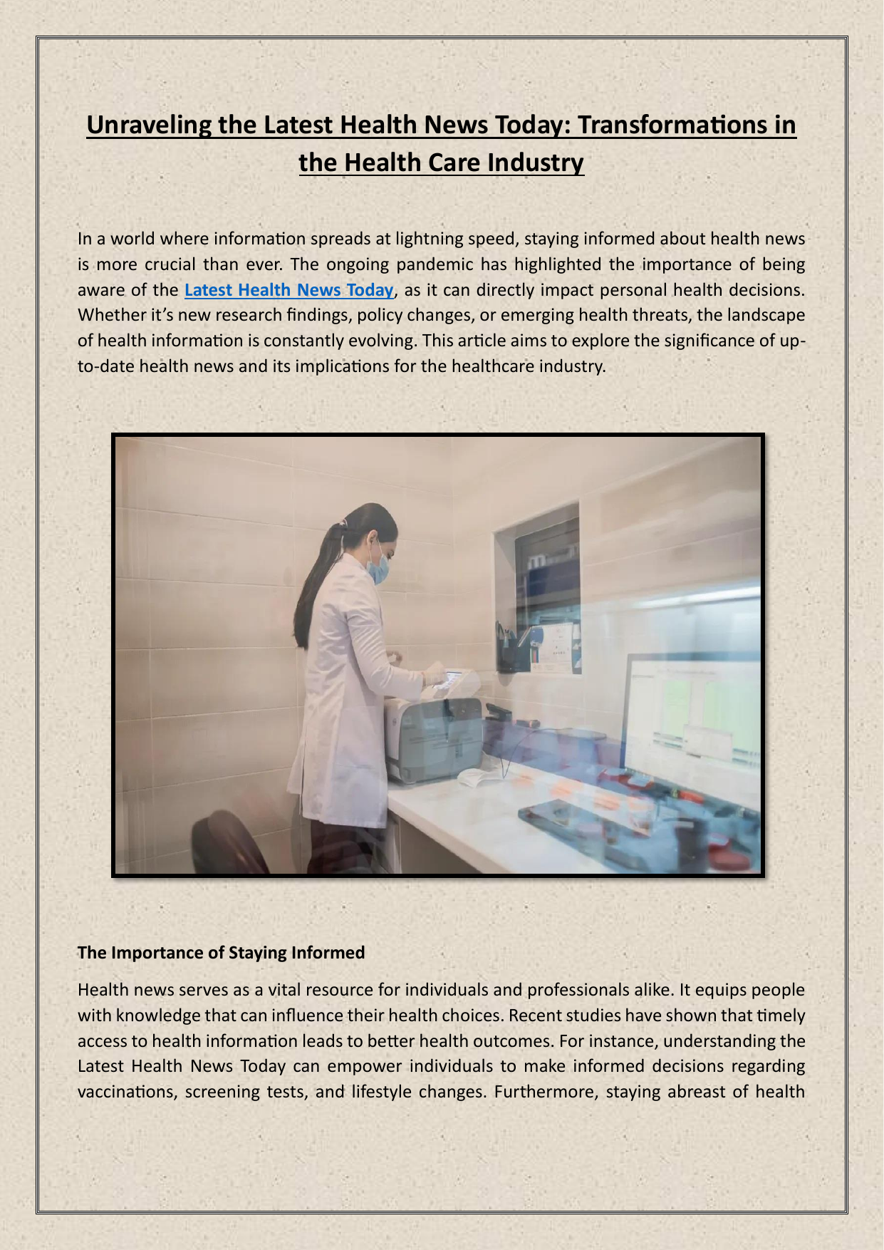Unraveling the Latest Health News Today: Transformations in the Health Care Industry In a world where information spreads at lightning speed, staying informed about health news is more crucial than ever. The ongoing pandemic has highlighted the importance of being aware of the Latest Health News Today, as it can directly impact personal health decisions. Whether it’s new research findings, policy changes, or emerging health threats, the landscape of health information is constantly evolving. This article aims to explore the significance of upto-date health news and its implications for the healthcare industry. The Importance of Staying Informed Health news serves as a vital resource for individuals and professionals alike. It equips people with knowledge that can influence their health choices. Recent studies have shown that timely access to health information leads to better health outcomes. For instance, understanding the Latest Health News Today can empower individuals to make informed decisions regarding vaccinations, screening tests, and lifestyle changes. Furthermore, staying abreast of health trends can foster a proactive approach to personal health management, leading to more effective prevention strategies. Moreover, health care providers rely on current information to deliver optimal care. Physicians, nurses, and other health professionals must stay informed about advancements in treatments and protocols. This knowledge not only enhances patient care but also improves overall health system efficiency. The connection between health news and patient outcomes underscores the necessity of consistent engagement with reliable sources of information. Navigating the Digital Health Landscape The rise of digital media has transformed how health news is disseminated. Online platforms, social media, and health blogs have become significant channels for sharing information. While these platforms increase accessibility, they also present challenges. Misinformation can spread just as quickly, leading to confusion and anxiety among the public. Therefore, it is essential to discern credible sources from unreliable ones. Reliable outlets provide thorough reporting on the Latest Health News Today, ensuring that readers receive accurate information. Healthcare organizations, government health agencies, and well-established news outlets are typically trustworthy sources. By prioritizing accurate reporting, these organizations contribute to a more informed public that can engage more effectively with health care services. Trends Shaping the Healthcare Industry As the healthcare landscape evolves, several key trends are emerging. Telehealth, for instance, has gained significant traction due to its convenience and accessibility. Patients can now consult with healthcare professionals from the comfort of their homes, making health services more reachable. This shift reflects a broader trend toward patient-centered care, emphasizing convenience and accessibility. Alongside telehealth, digital tools such as health apps and wearable devices are revolutionizing health monitoring. These technologies enable individuals to track their health metrics in real time, encouraging proactive health management. The integration of technology into health care aligns with the growing emphasis on personalized medicine, where treatments are tailored to individual needs and circumstances. This dynamic environment is a testament to the ongoing changes within the Health Care Industry News, reflecting how technology is reshaping patient care. Current Challenges in Health Care Despite the advancements, the healthcare industry faces several challenges. Accessibility remains a significant issue, particularly for underserved populations. While technology offers new solutions, disparities in access to digital tools can exacerbate existing inequalities. It is crucial to address these gaps to ensure that all individuals can benefit from advancements in health care. Additionally, navigating the complexities of health insurance can be daunting. Many people remain unaware of their coverage options, leading to delays in seeking necessary care. The Health Care Industry News frequently highlights these issues, underscoring the need for greater transparency and education regarding health insurance policies. Efforts to simplify insurance processes and enhance public understanding are essential for improving health outcomes across various demographics. Looking Ahead: The Future of Health News and Care As the world continues to grapple with health challenges, the role of health news will only become more critical. Emerging health issues, such as antibiotic resistance and mental health crises, require immediate attention and public awareness. Staying informed about the Latest Health News Today will enable communities to respond effectively to these challenges. Moreover, the future of health care will likely involve further integration of technology and personalized approaches to treatment. Innovations in data analytics can enhance predictive modeling, leading to better preventive care. As these changes unfold, health professionals and the public must remain engaged with credible news sources to navigate the complexities of the evolving health landscape. Conclusion Keeping abreast of the Latest Health News Today and understanding the intricacies of the Health Care Industry News is essential for informed decision-making. The interplay between technology, accessibility, and public awareness shapes the future of health care. Engaging with reliable sources, such as mdnewsline.com, can enhance one's understanding of health issues and ultimately lead to improved health outcomes for all.