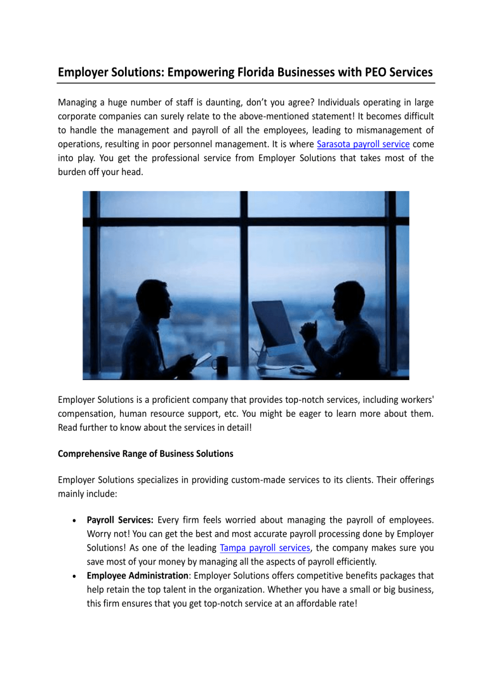 Employer Solutions: Empowering Florida Businesses with PEO Services Managing a huge number of staff is daunting, don’t you agree? Individuals operating in large corporate companies can surely relate to the above-mentioned statement! It becomes difficult to handle the management and payroll of all the employees, leading to mismanagement of operations, resulting in poor personnel management. It is where Sarasota payroll service come into play. You get the professional service from Employer Solutions that takes most of the burden off your head. Employer Solutions is a proficient company that provides top-notch services, including workers' compensation, human resource support, etc. You might be eager to learn more about them. Read further to know about the services in detail! Comprehensive Range of Business Solutions Employer Solutions specializes in providing custom-made services to its clients. Their offerings mainly include: • • Payroll Services: Every firm feels worried about managing the payroll of employees. Worry not! You can get the best and most accurate payroll processing done by Employer Solutions! As one of the leading Tampa payroll services, the company makes sure you save most of your money by managing all the aspects of payroll efficiently. Employee Administration: Employer Solutions offers competitive benefits packages that help retain the top talent in the organization. Whether you have a small or big business, this firm ensures that you get top-notch service at an affordable rate! • Human Resource Support: Have you ever been stuck while managing sensitive workplace issues? You can easily manage all the stressful HR-related operations with Employer Solutions! The company provides a certified HR professional to handle all such tasks promptly. Looking for a Trusted Partner for Business Growth? If you have a business in Tampa, Sarasota, Bradenton, Fort Myers, Naples, or near Florida, then you can get these services there. It provides an expert solution to all your problems without much hassle! The company's dedication and focused approach help grow your business to the next level. Employer Solutions goes beyond just offering you service. It builds long-term relationships with business clients by meeting their unique needs. What makes this service unique? Employer Solutions has a remarkable business image, reflected through its high-quality service. Their uniqueness lies in delivering customized PEO services tailored to meet the needs of businesses across Florida. Additionally, you can also get remarkable HR outsourcing Tampa to manage your HR-related functions in an effective manner. For more information, visit https://employersolutionspeo.com/. Original Source: https://bit.ly/4dCwLO6
